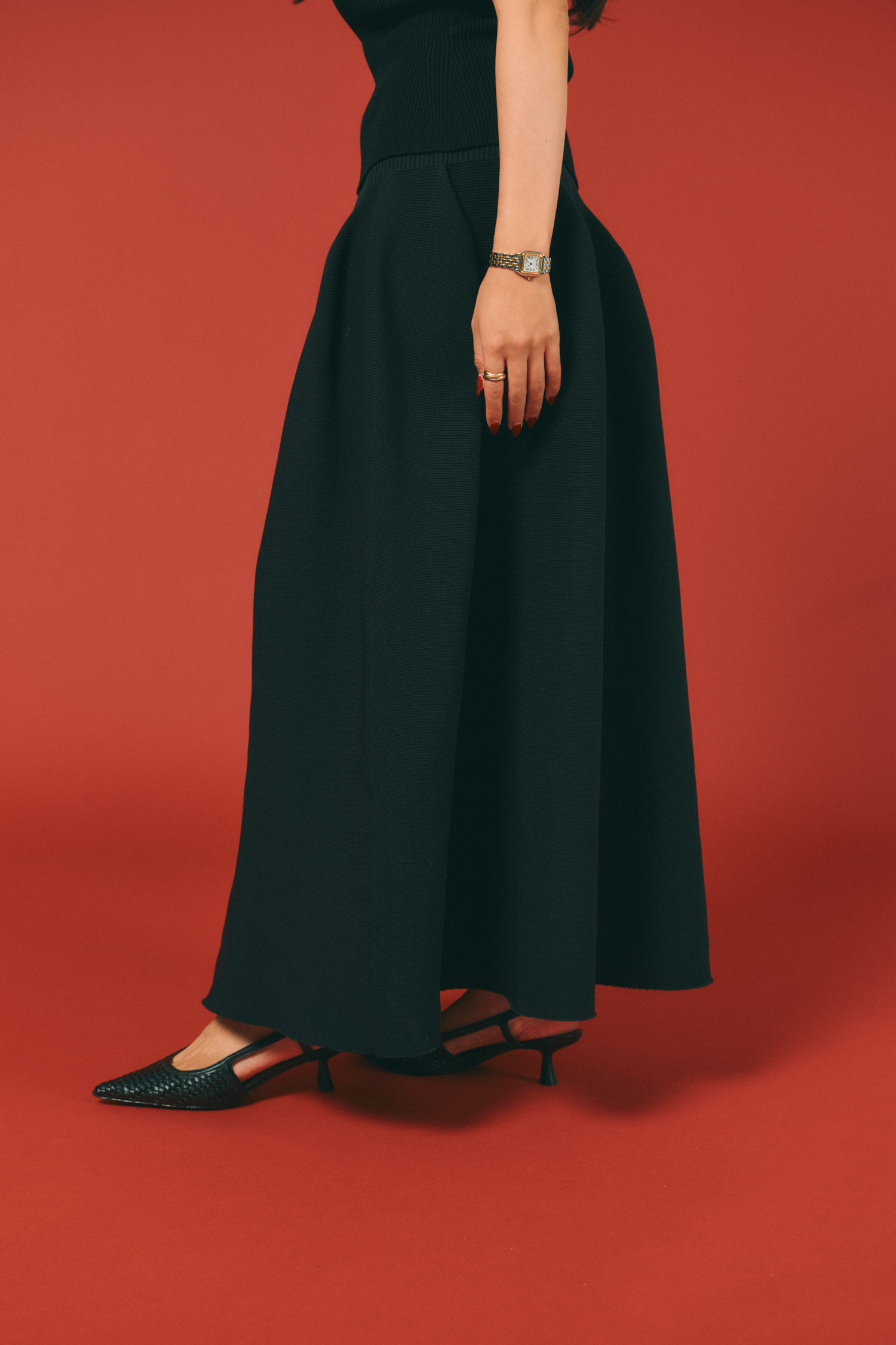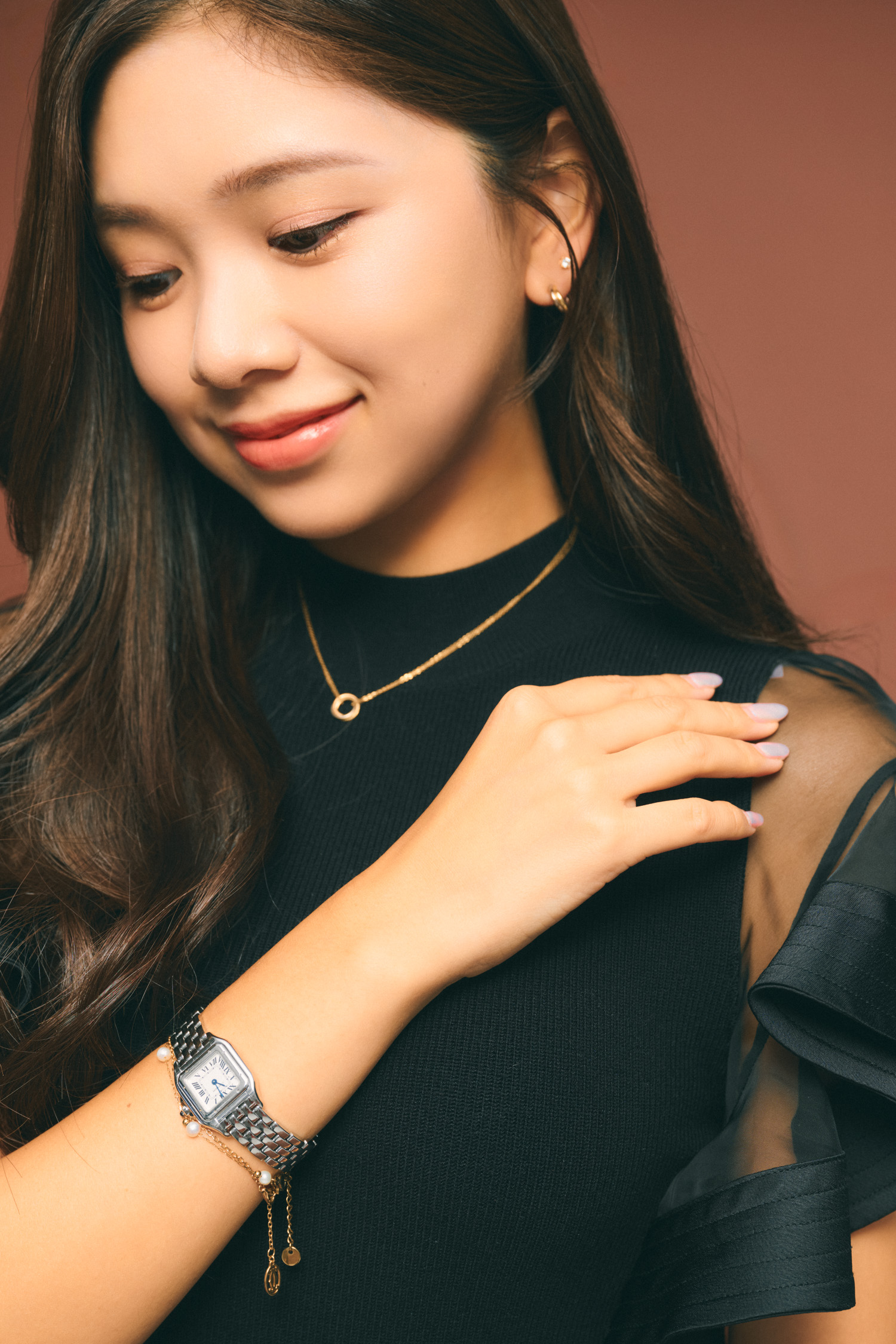 「手持ちのゴールドジュエリーは、黒コーデとも相性抜群。カルティエのトリニティピアスとネックレスは、祖母からの誕生日プレゼント。ゴールド・ピンクゴールド・シルバーの3色が重なっていて、どんなジュエリーとも馴染む万能デザインです。カルティエのパンテールは成人のお祝いで父からもらったもの。ブレスレットはカルティエとニースで買ったパールを2本付け。基本つけっぱなし派なので、18Kのジュエリーが安心。ゴールドの艶感を重ねることで、コーデがラグジュアリーに仕上がります」