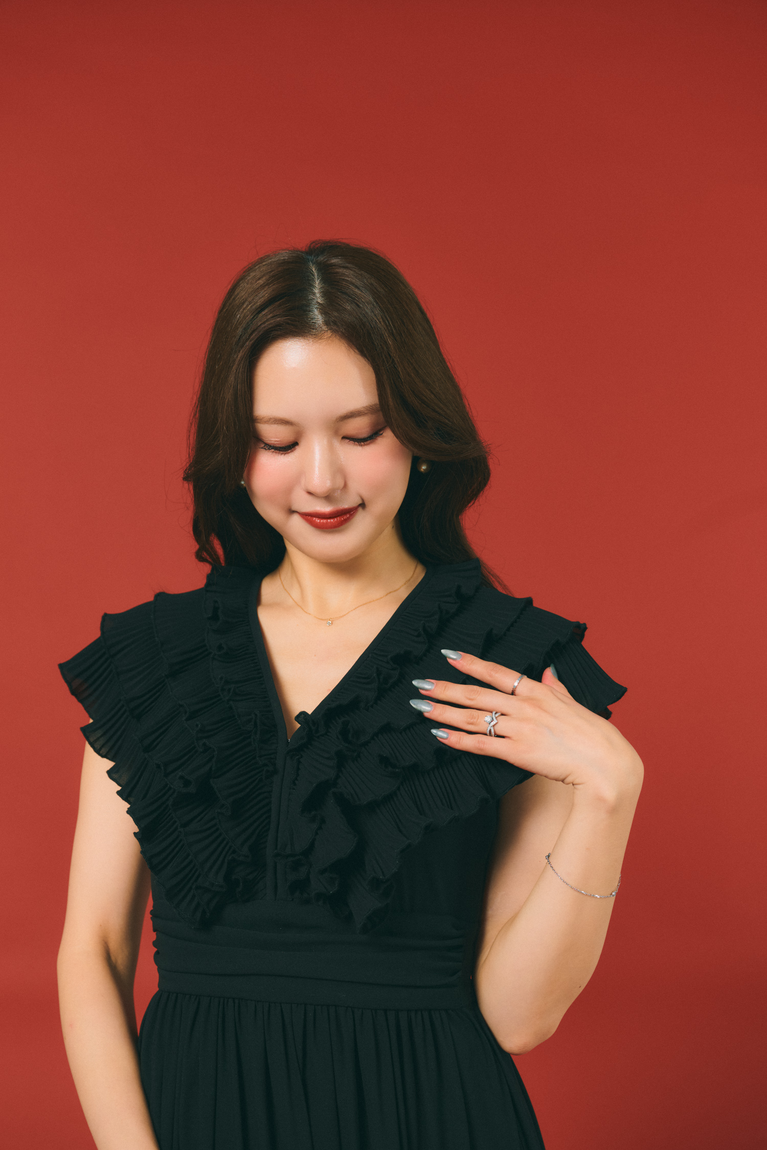 「黒ワンピって重たく見えがちですが、素材感で軽さを出すのがこだわりポイントです。シフォンの揺れ感がキレイなローブブランのワンピースに、ディオールの小物を合わせて華やかさをプラス。きちんと感を出したい日や、ホテルランチなどちょっと特別なシーンにも対応できる万能な黒コーデです」