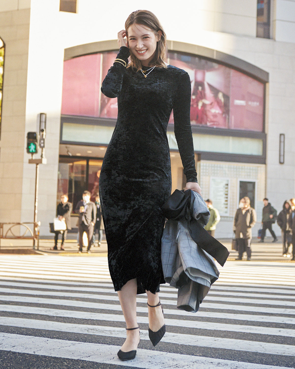 黒のベロアワンピは、ほどよいフィット感と光沢で着るだけで華やかに。ストラップシューズを合わせればクラシカルにまとまり、女っぷりもアップ。手に持っているジャケットをさらりと肩掛けすれば、ホテルランチにも映える大人の装いが完成します。
