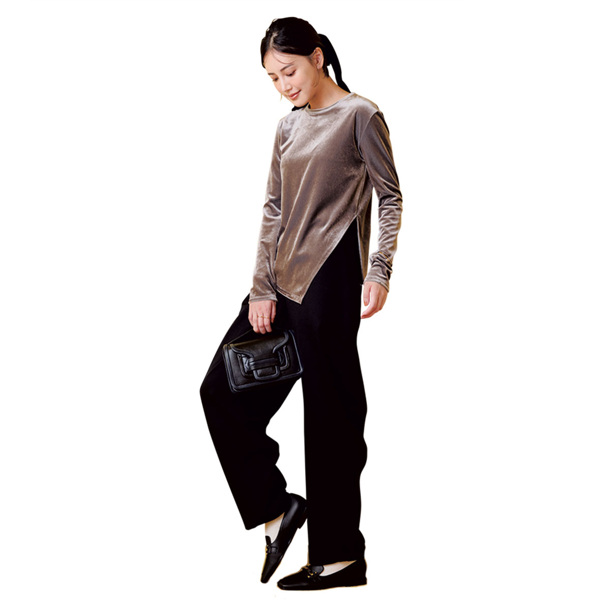 大胆なサイドスリット入りベロアトップスは、アウトして着ることでモードな雰囲気に。スリットが縦のラインを強調してくれるので、重たく見えがちな黒パンツもシャープに映ります。クラッチバッグとローファーで仕上げれば、都会的な大人スタイルに着地。