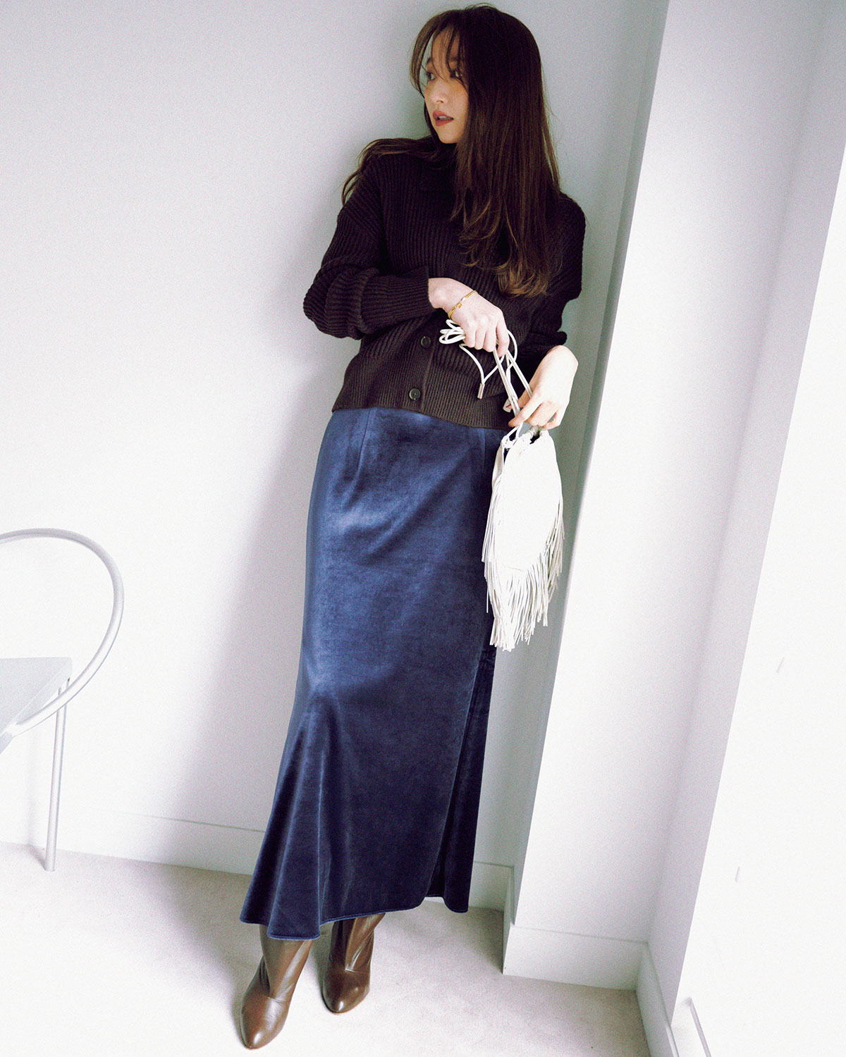 深みのあるダークトーンでも、ベロア特有の艶めきがあることで表情豊かに見えるスカート。広がりすぎないシルエットだから、ロング丈でもすっきりと着こなせます。リブニットやブーツを合わせれば、落ち着きの中に大人の華やぎが漂う装いに。