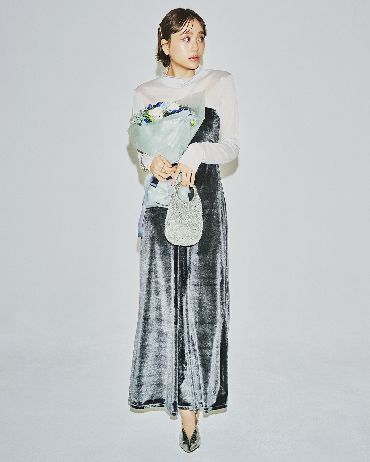 お呼ばれには、リッチな光沢が映えるベロアのベアワンピを。シアートップスを重ねれば、透け感とのコントラストで奥行きが生まれ、肌見せを抑えながらメリハリのある装いに。インナーをニットに変えたり、上からジャケットを羽織ったりすれば、デイリーにも馴染む万能ワンピへとシフトします。