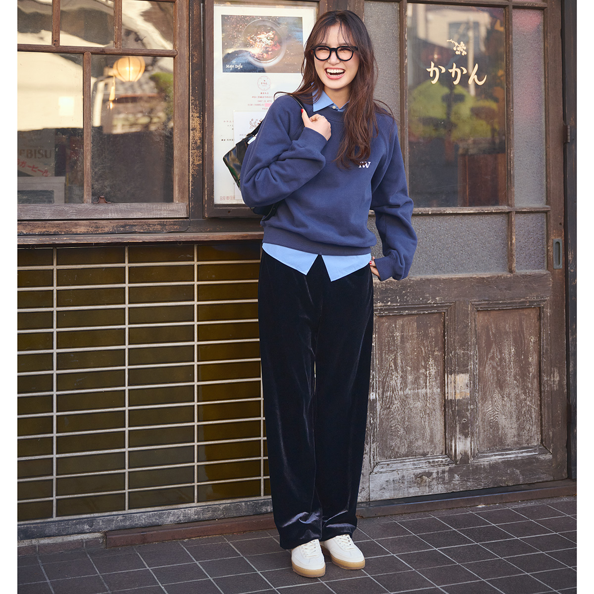 スウェット×シャツのラフなレイヤードに、ベロアパンツを投入して大人っぽく格上げ。ほどよい光沢が加わることで、カジュアルながらも品のある仕上がりに。スニーカー合わせでもきちんと感が残り、こなれたデイリーコーデに決まります。