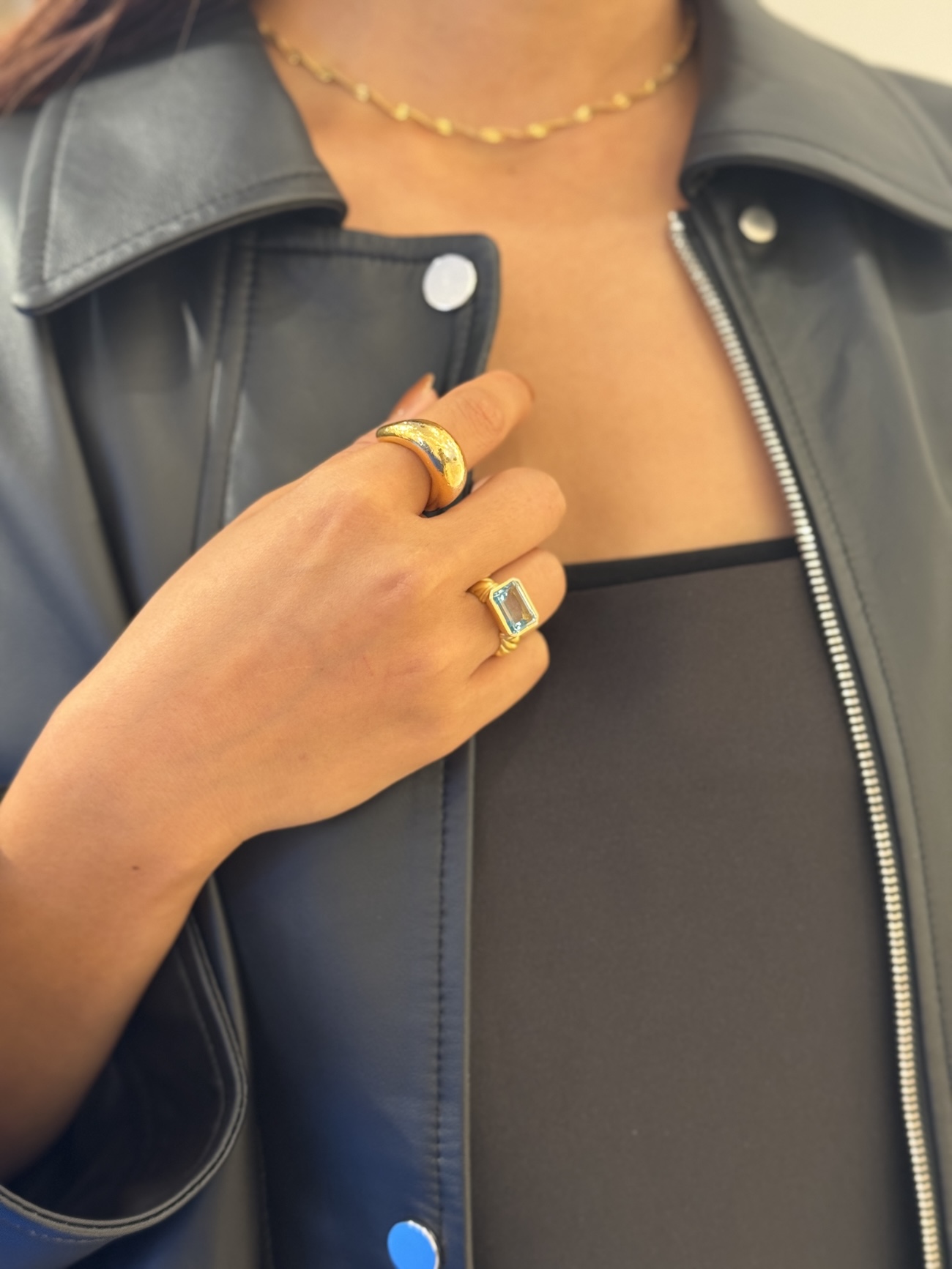 もうひとつ身につけている色石のリングは、ヴィール(vveer)のもの。こちらは今シーズンからスタートした、エストネーション発のジュエリーブランドです。初コレクションの中でも、ブルートパーズのこのリングをずっと狙っていました。自分自身のラッキーカラーがブルーなので、ローンチ後すぐに購入。おもちゃのような可愛さもあり、手もとを華やかに美しく見せてくれるので気に入っています。