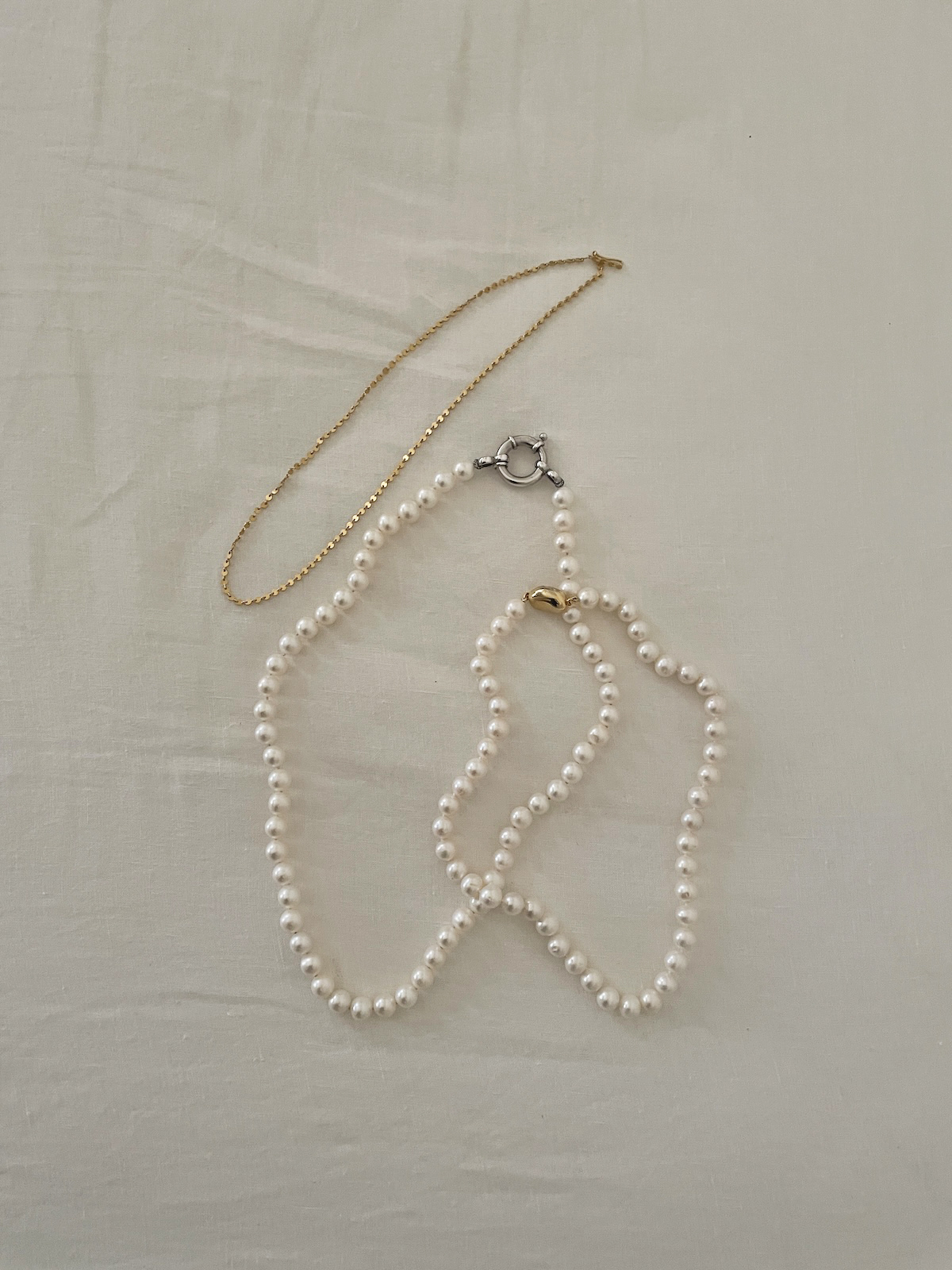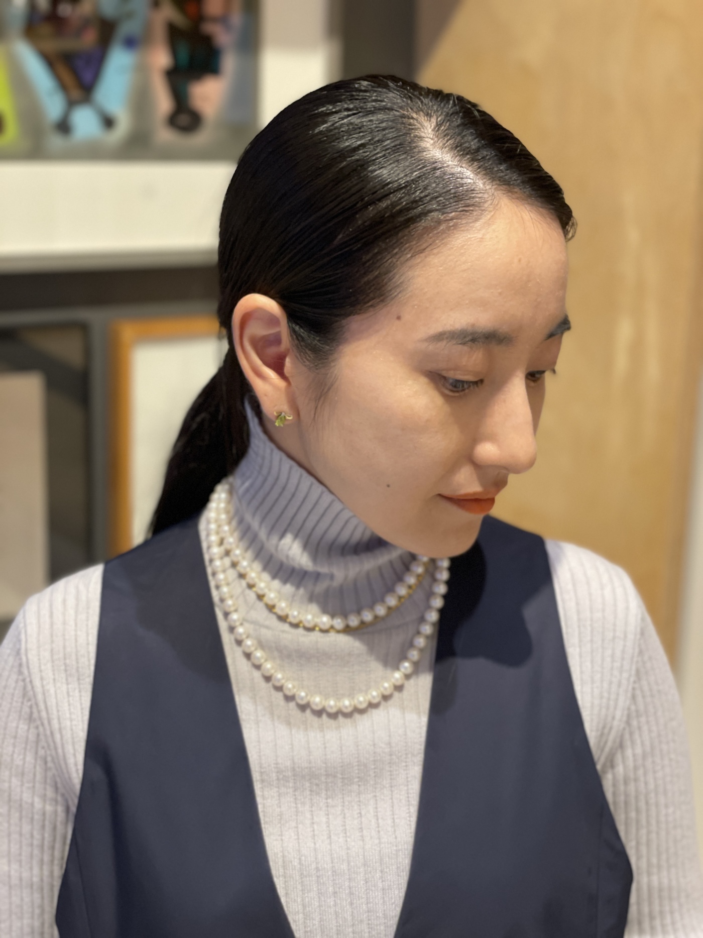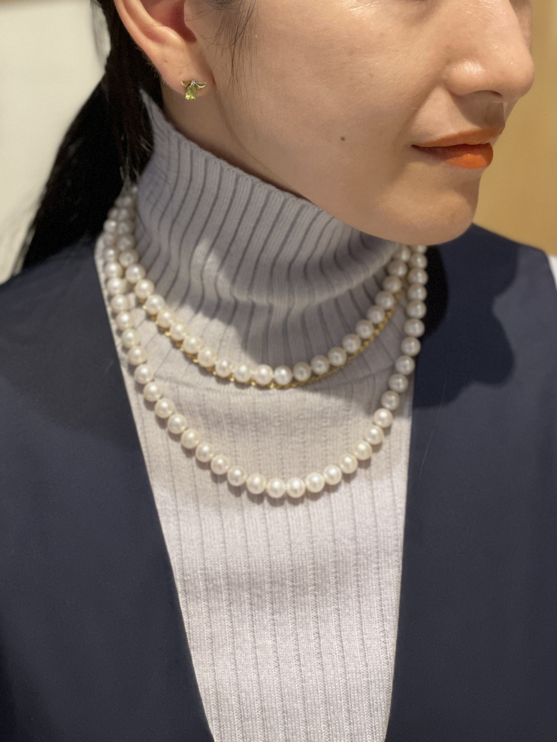 パールは一見クラシカルな印象を受けますが、レイヤードする事でスタイリングの印象を変えられるので、自分らしいコーディネートを作るために欠かせないベーシックアイテムです。
