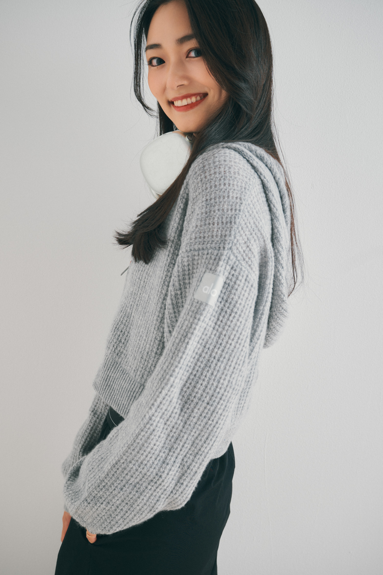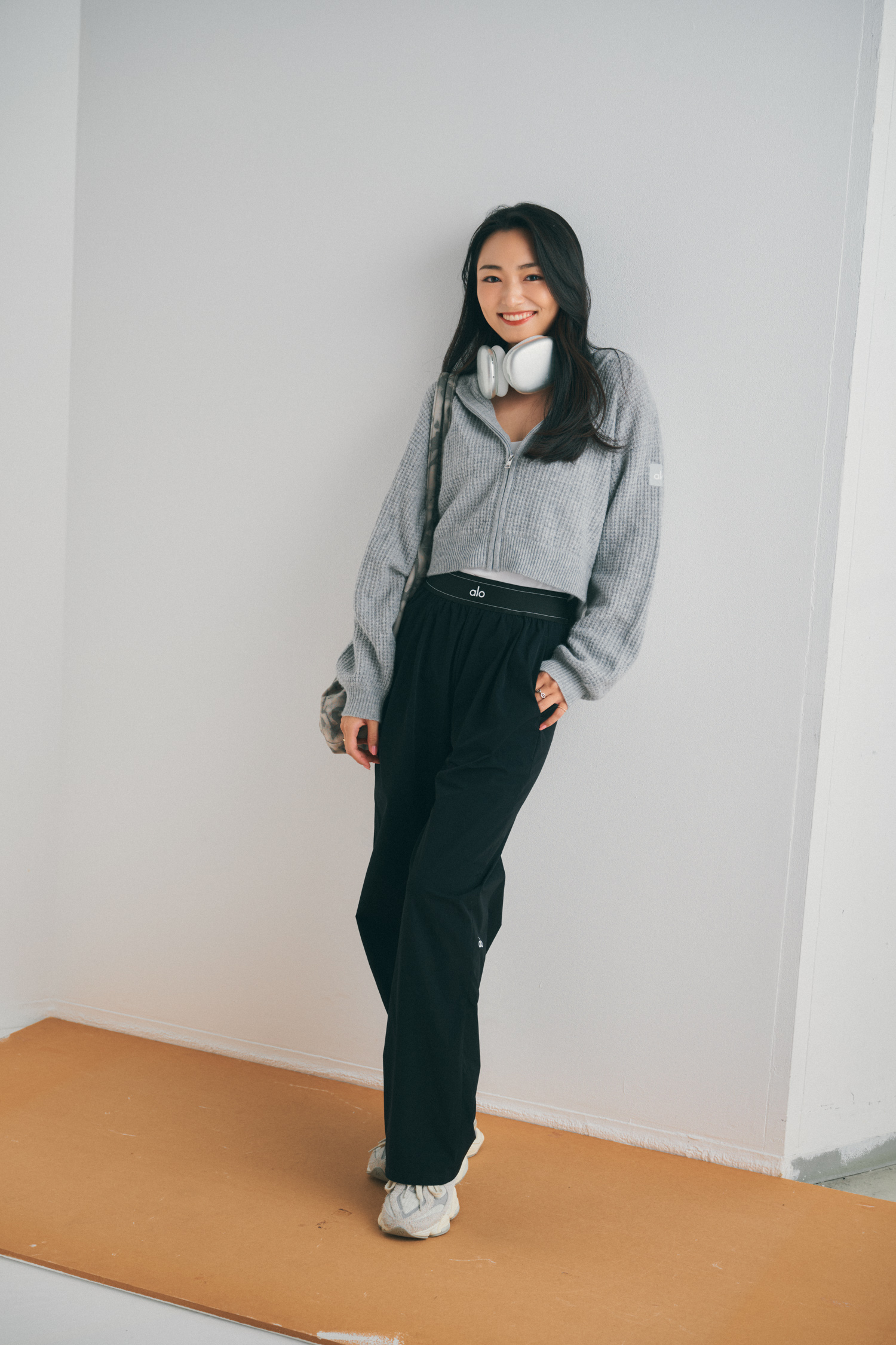 「アローヨガの短丈パーカは、とにかく着心地が抜群。ドロップショルダーでゆるっと着られて、薄手のニット素材なのにしっかり暖かいです。冷えやすく温度調整が難しい機内では、こういう軽く羽織れるパーカが本当に便利。長時間のフライトでもストレスなく過ごせます」