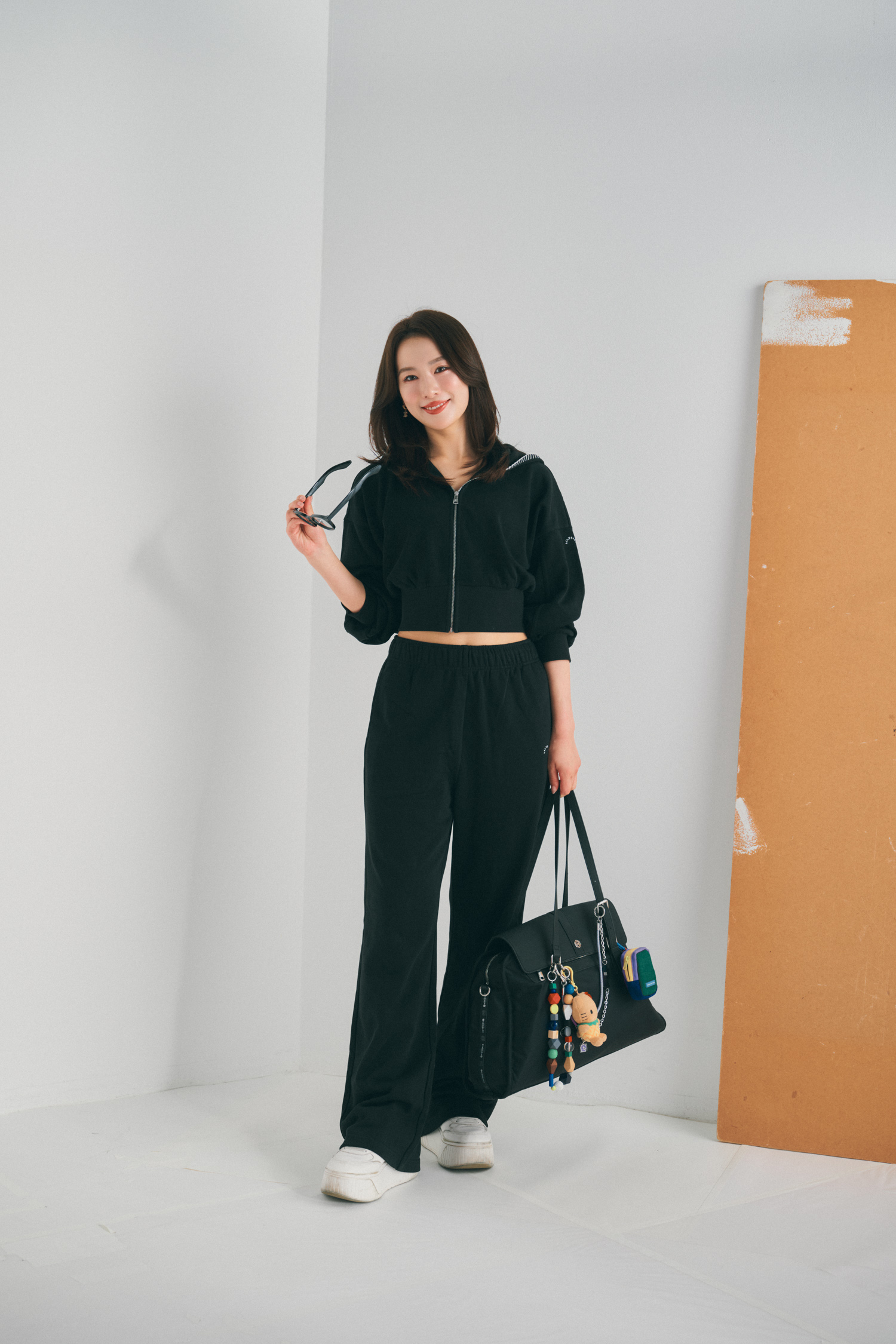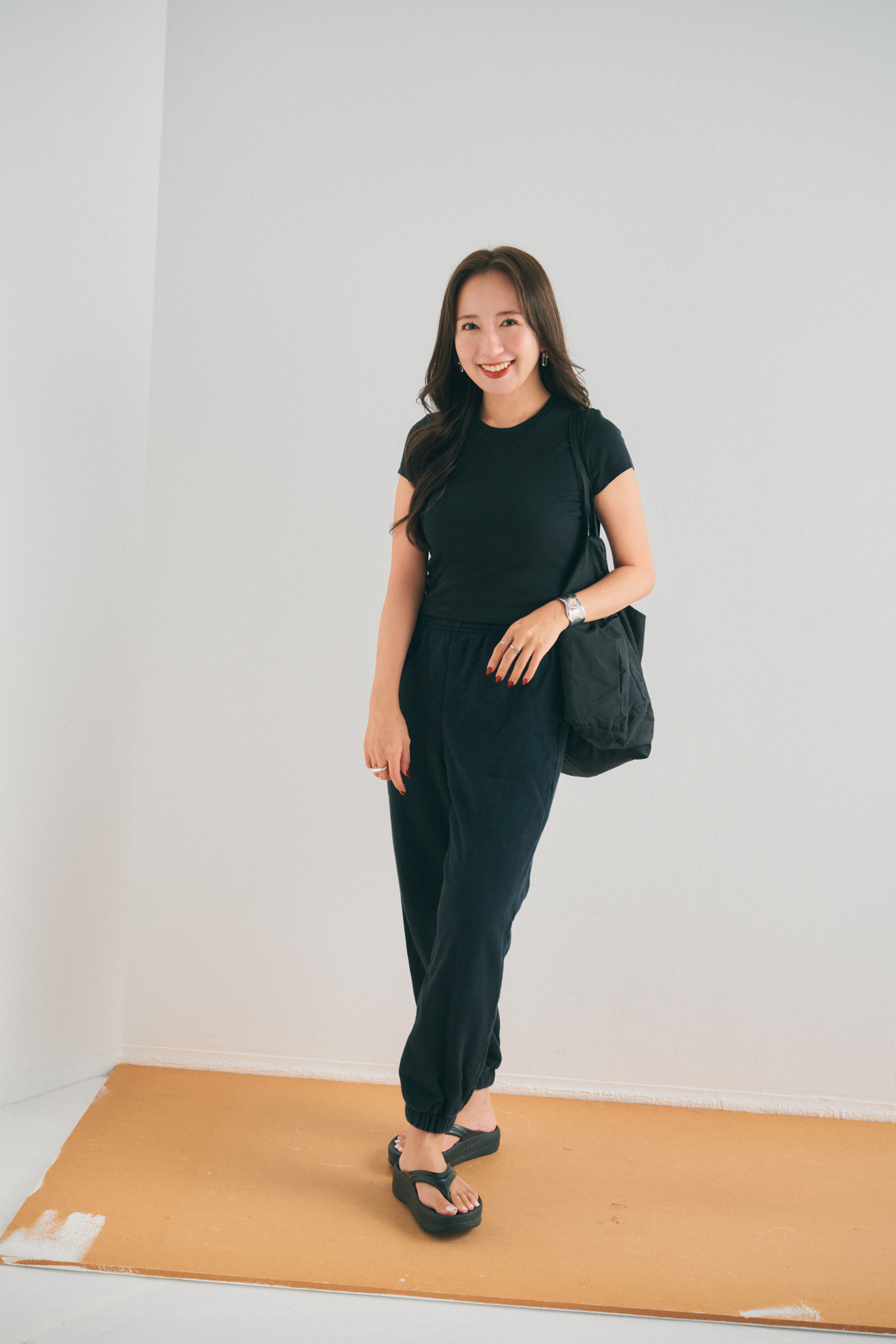 「長時間フライトの日は、とにかくラクさを最優先にしています。上下ユニクロでも、黒でまとめることでほんのりモードな印象に。柔らかくて締め付けがないので、寝落ちしてしまってもストレスゼロの組み合わせです。バッグはスリーコインズで見つけた折りたためるタイプを愛用中。軽くて扱いやすいので、機内バッグとして大活躍。スーツケースに引っ掛けられるのが推しポイント。スリーコインズは旅グッズが充実しているので、旅行前には必ずチェックしています」