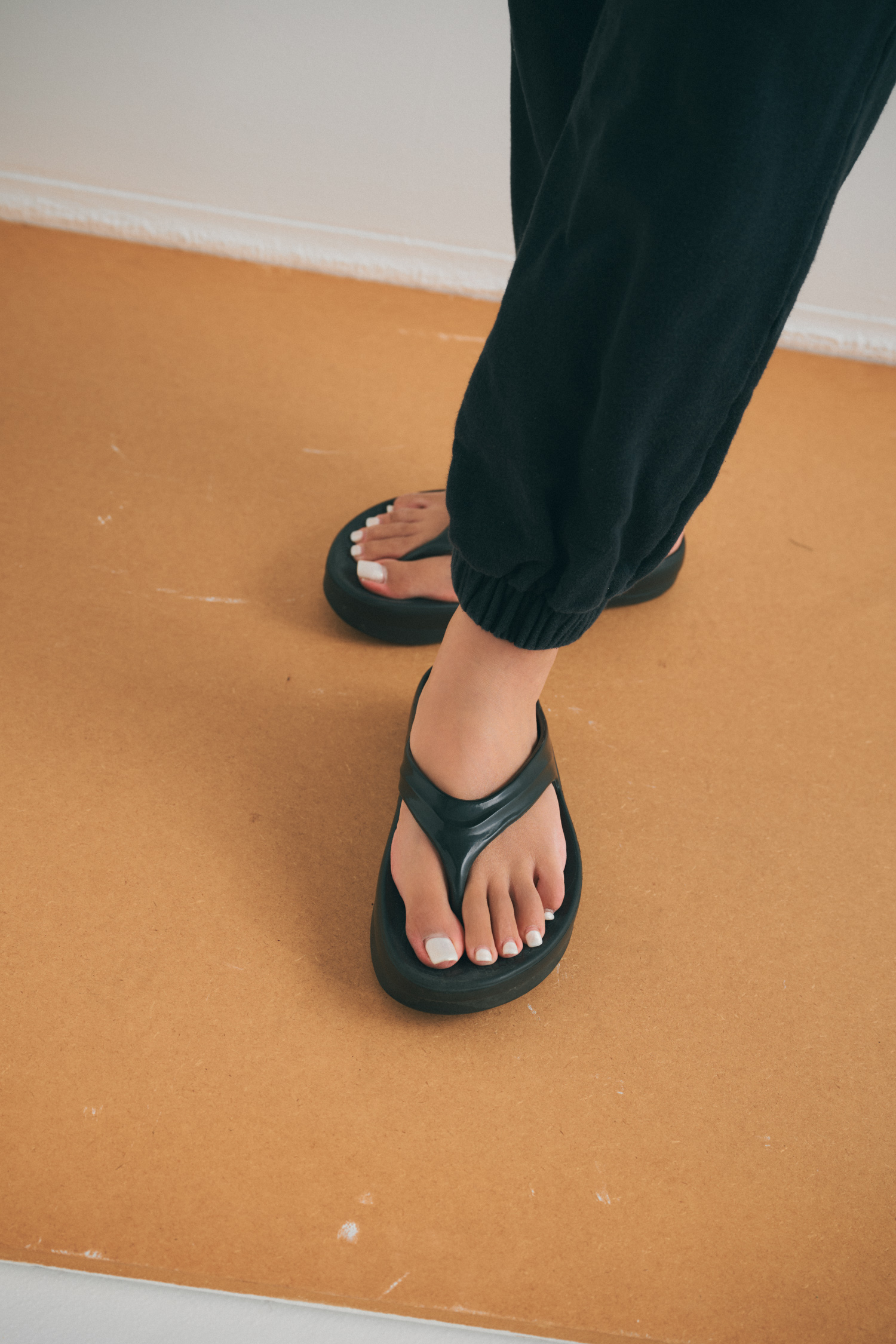 「機内は暑くなったり冷えたりと気温差が激しいので、インナーは絶対に半袖。冬でも半袖+パーカが鉄板スタイルです。ボトムスは動きやすくてシワになりにくいH&Mのスウェットパンツを合わせました。ウエストがゴム仕様でストレスフリー。機内ではメディキュットを履くことも多いので、脱ぎ着しやすくて便利です。足元は楽ちんなので、冬でもサンダルで過ごしています」