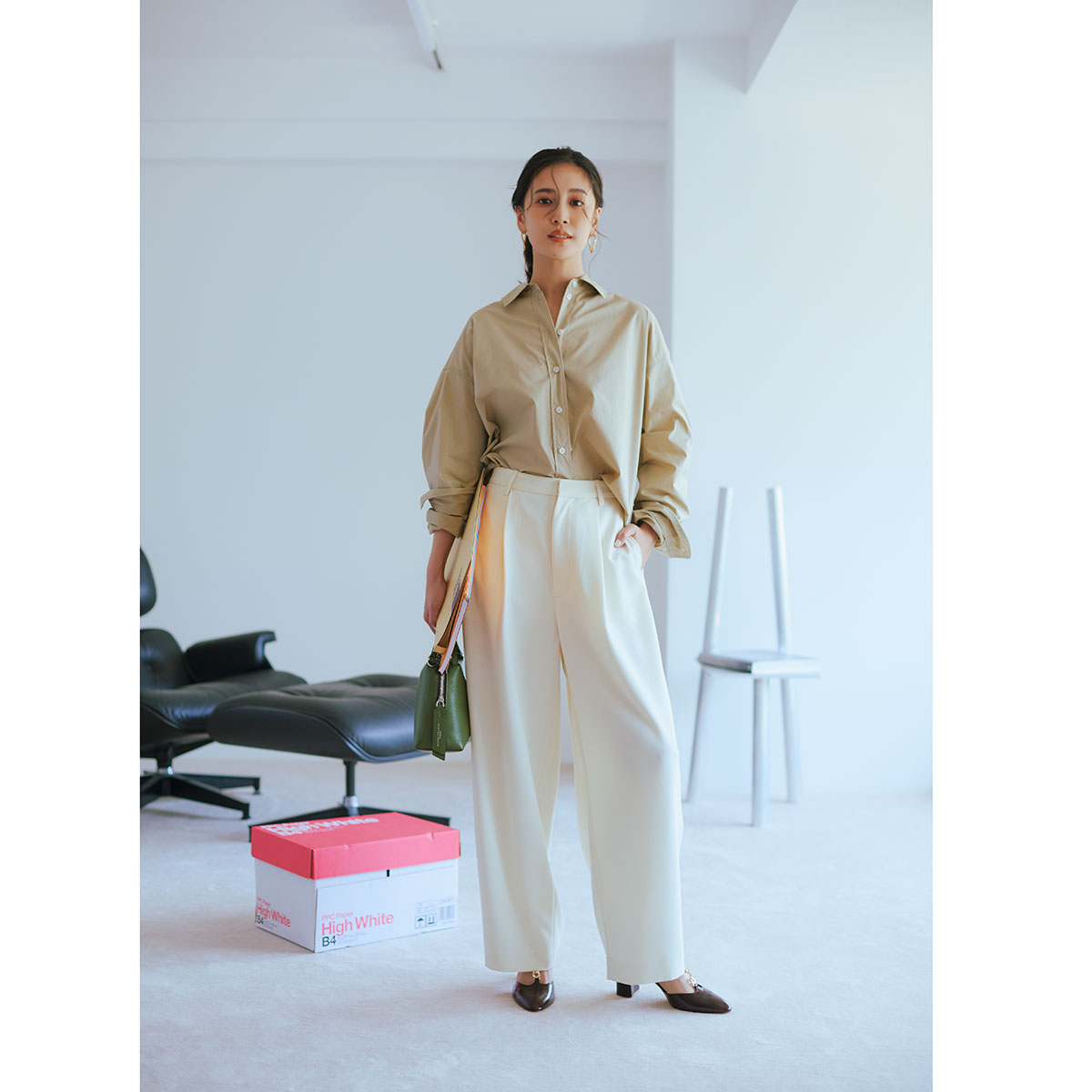 ベージュシャツ×白ワイドパンツのすっきりコンビに、金具付きTストラップのオープンパンプスをセレクト。太めヒールならではの安定感に加え、クラシカルなディテールが足元からきちんと感を高めてくれます。シンプルな通勤コーデも、ほんのりレトロな雰囲気が加わることで奥行きのある着こなしに着地。