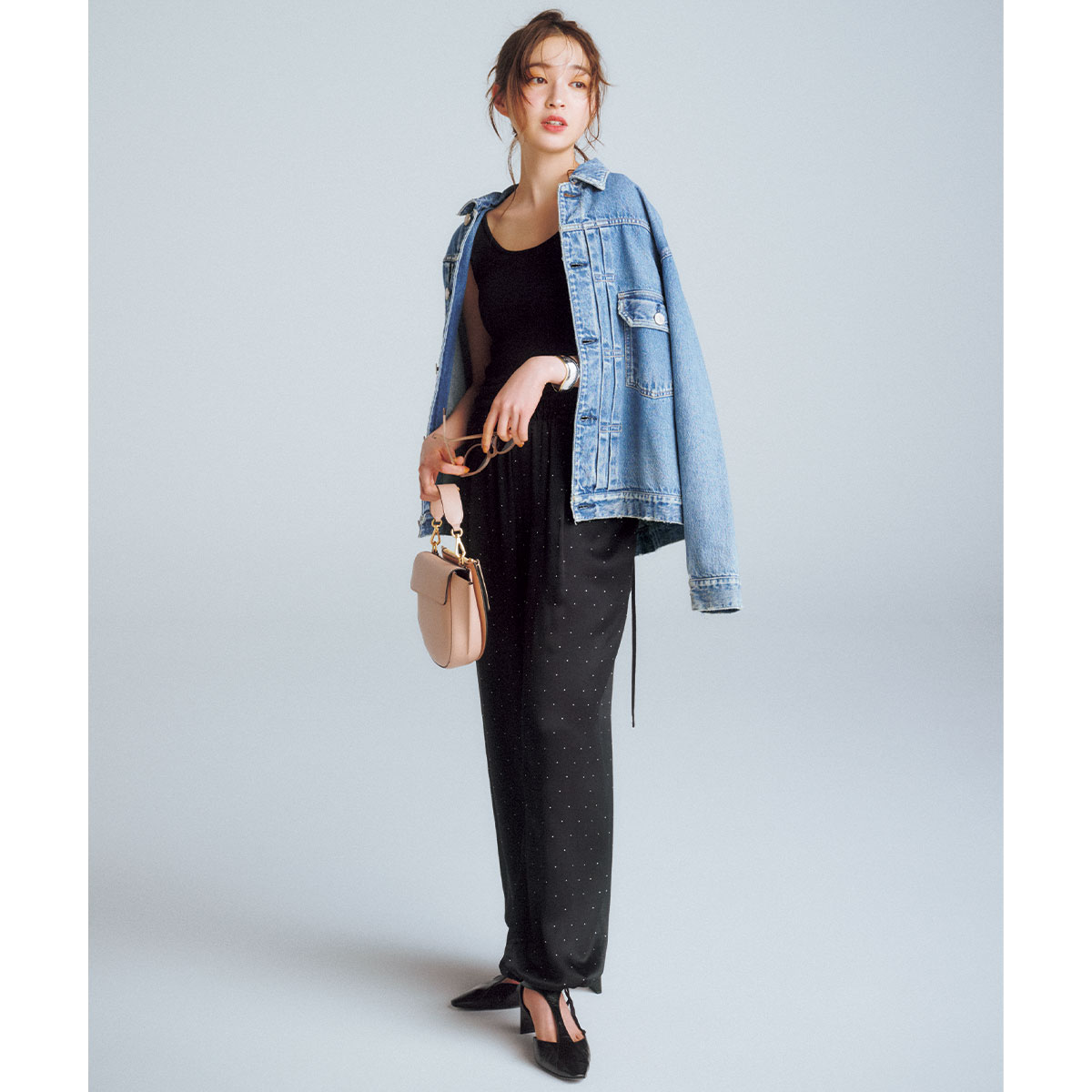 秋の定番アウター、デニムジャケットはオールブラックに合わせるとグッと大人顔に。縦に流れるIラインシルエットがシンプルだからこそ、ジャケットのオーバーサイズが映えてこなれたムードに決まります。足元はTストラップヒールで軽さと女らしさを添えて、洗練ムードを底上げするのがカギ。