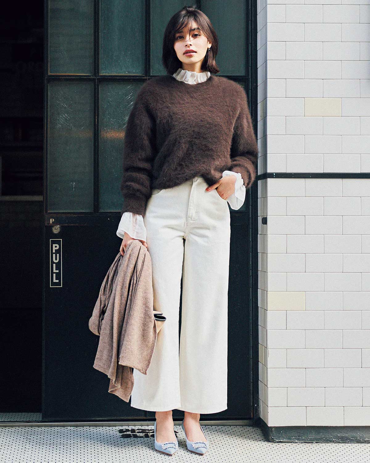 ふんわりブラウンニット×白ワイドパンツのニュートラルなスタイルに、ビジュー付きパンプスで煌めきを投入。控えめなカラーリングでも、一点の輝きがあるだけでグッと華やかに。デイリーにも取り入れやすく、ちょっとしたお出かけや仕事後の予定にも対応できる便利な一足です。