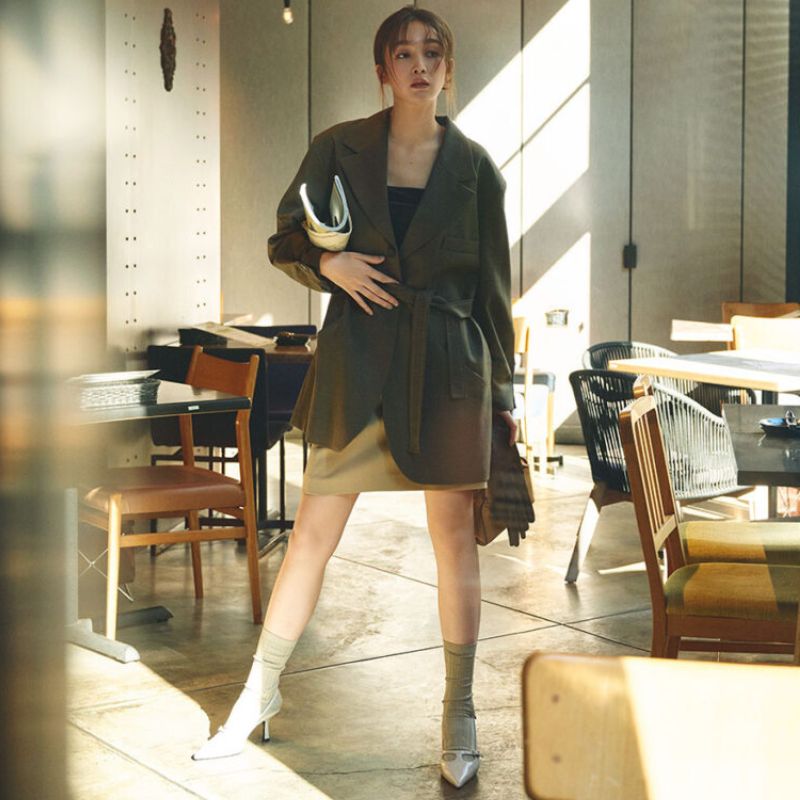 オーバーサイズのジャケットにミニボトムを合わせた、ハンサムさとヘルシーさが共存するスタイル。足元はシルバーのポインテッドトゥにソックスを合わせて、クラシカルな遊び心をプラス。重たくなりがちな秋コーデも、軽やかな抜けを演出できる鮮度の高い組み合わせです。