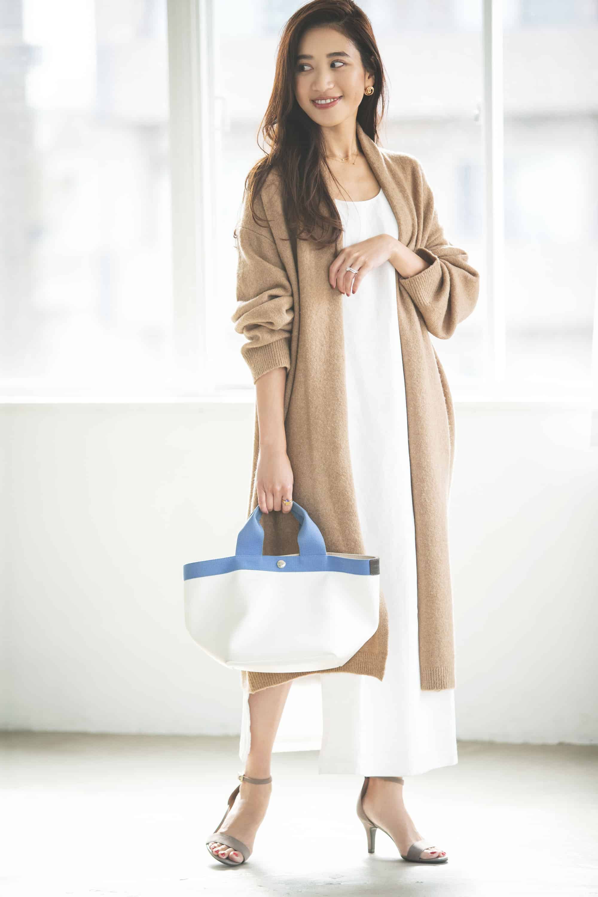 「社内で打ち合わせの予定がある日、社内から出ない日は過ごしやすいワンピースが正解です。1枚でさらっと着られるワンピースはもたつかず、大人らしく着られるシルエットが気に入っています。夏は一枚で着ていて、秋はカーディガンを重ねればOK。生地が厚手なので透ける心配もなし!カーディガンはニット生地で、冬はロングコートの下に重ね着して2シーズン活躍させます」