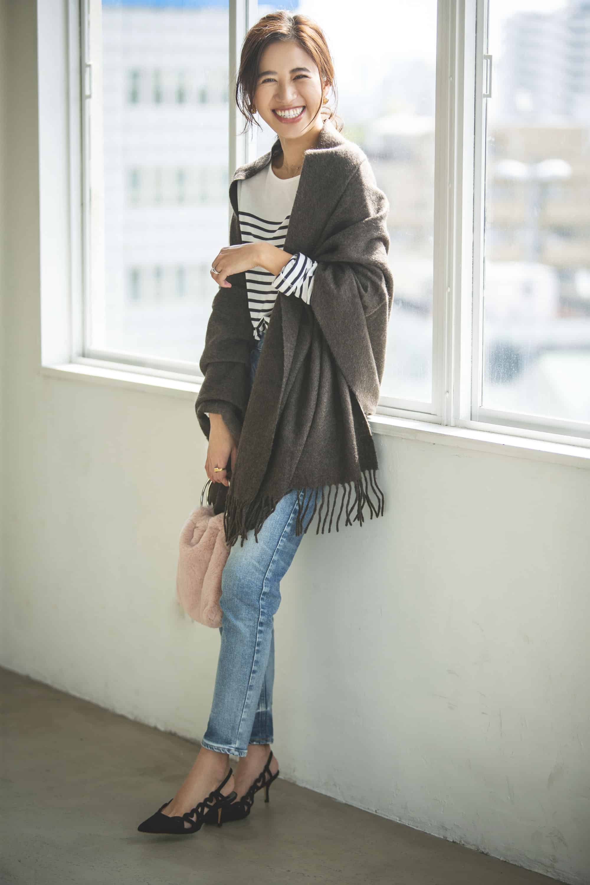 「大好きなデニムはリラックスモードなアフター5に予定がある日にぴったり。ドゥージーエムのボーダーカットソーはデニムにも相性が良いのにカジュアルすぎない着こなしを叶えてくれます。ゆるっとしたシルエットなのでインして着ると、大人っぽく見えます。最近デニムの通勤が会社でOKになったんですが、まだあまり社内で浸透していないので、足元はきちんとして見えるヒールできれいめをキープしています。寒さ対策のストールはパサッと羽織るだけでコーデが華やぐので便利です。黒のコートが多いので、暗すぎないベージュを選んで正解でした!」