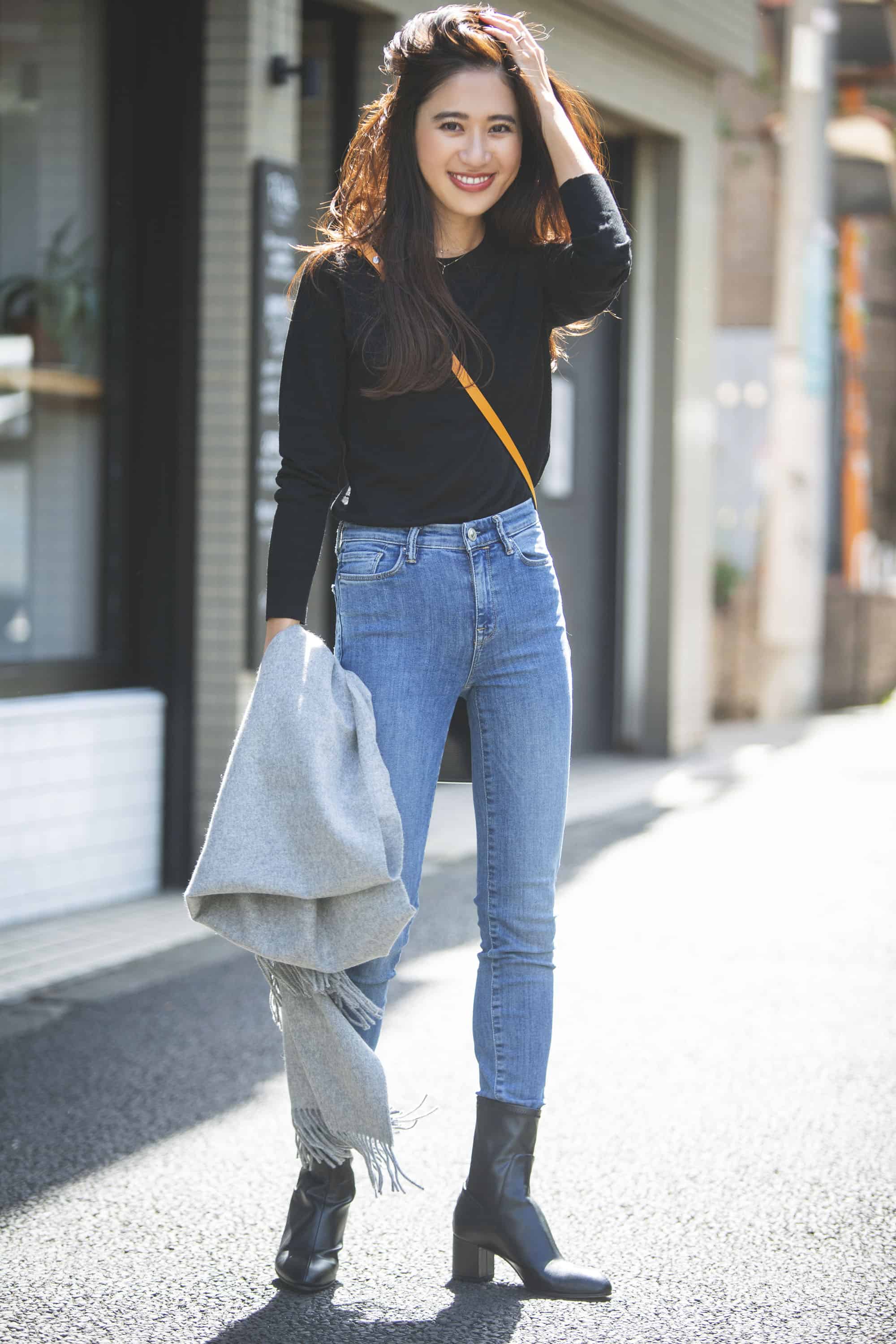 「ストレートデニムを探しているときに、友達に聞いて教えてもらったALL SAINTS。ストレッチがすごく効いていて履きやすいんです。細身でもパツパツのシルエットではないので、ドライブや旅行のときに選びたい一着。ストールは薄いグレーなので色が重くなりにくく、ワードローブに多い黒のアウターに軽さを与えてくれます」