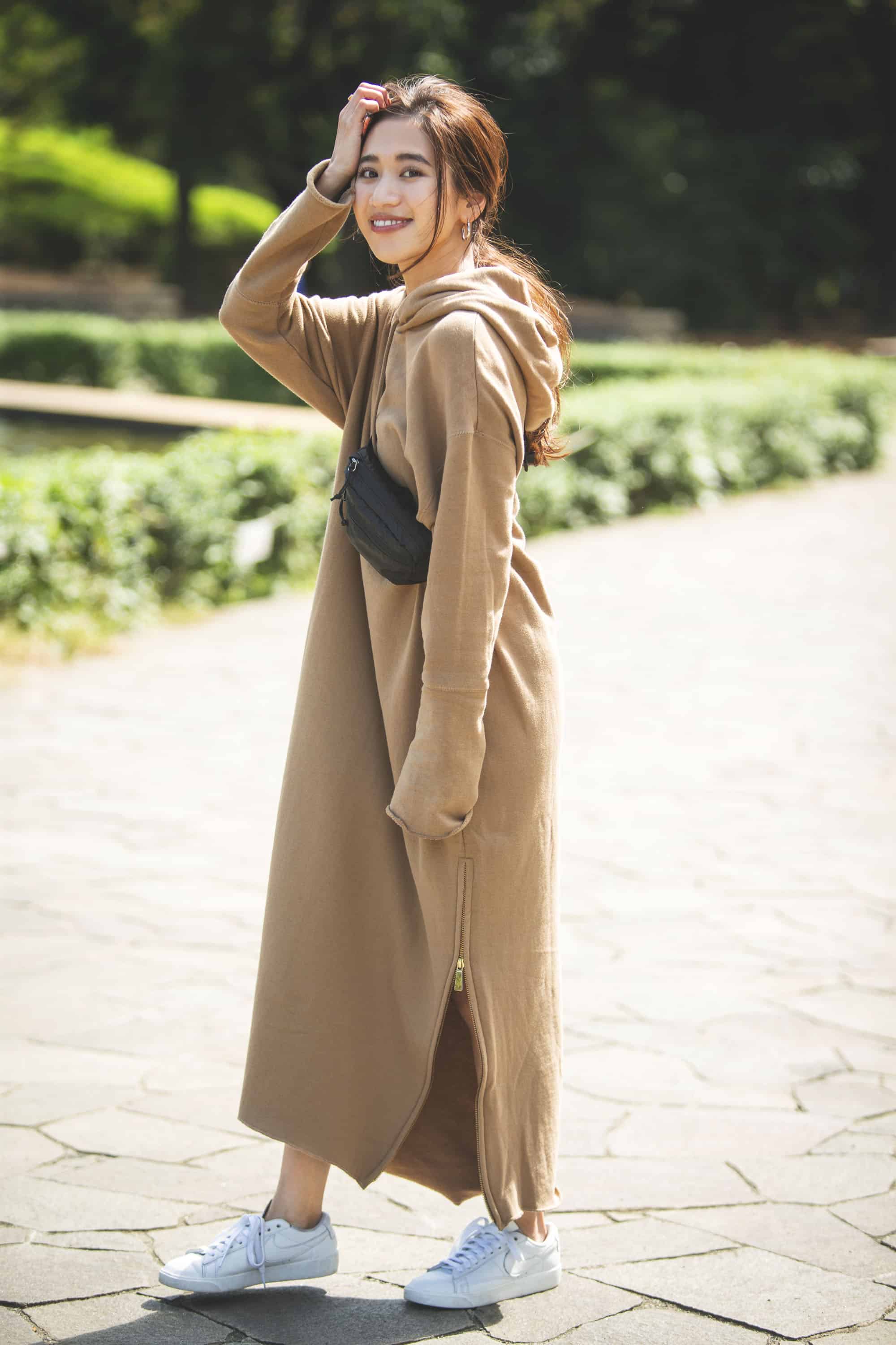 「週明け月曜からまた仕事なので、日曜はのんびり過ごすことが多いですね。公園をお散歩してコーヒー飲んで、っていうのが休日の日課です。背があまり高くない(158㎝)から、だぼっとしたシルエットのアイテムはトライしたことがなかったけれど、このワンピはサイドスリットのジップを開けて抜け感を作れるのでSサイズでも着やすいワンピです。袖の少し長いデザインも今っぽくてお気に入りです」