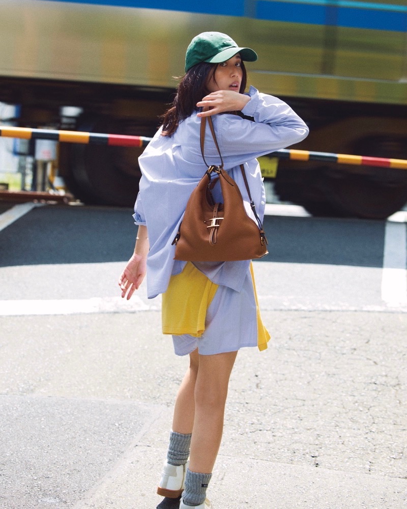 バッグ「T タイムレス バッグ」[H31.5×W28×D11]¥306,900(トッズ/トッズ・ジャパン)シャツ¥31,900ショートパンツ¥6,600キャップ¥10,450(すべてエイトンステイプルズ)腰に巻いたカットソー¥19,800(ATON/エイトン青山)タンクトップ¥11,000ソックス¥3,000(ともにTW)バングル¥63,800(ビジュードエム/ビジュードエム六本木ヒルズ)スニーカー¥33,000(タビト フォー オデット エ オディール/オデット エ オディール 新宿店)
