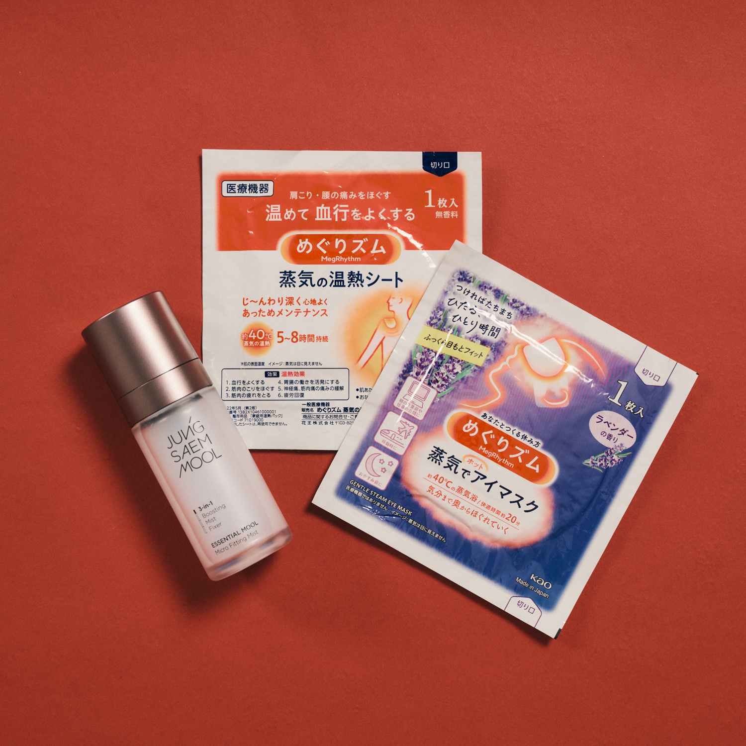 「機内は意外と冷えるので、めぐリズムの温熱シートを肩や腰に貼って過ごすのが定番です。深夜便が多いのですが、じんわり温まってくれるおかげで、長時間のフライトでもしっかりリラックスして眠れます。同シリーズのアイマスクもお気に入りで、ふわっと香る癒しの匂いに包まれると機内でも落ち着けるんです。友達と一緒のフライトでは、ちょっとしたプレゼントとして渡すとすごく喜ばれます。乾燥対策にはジョンセンムルのミニミストが必須。霧が細かくて使い心地がよく、機内の乾燥を少しでも感じたら手軽につけられます。ミニサイズなので荷物検査にも引っかからず、常にポーチに入れています」