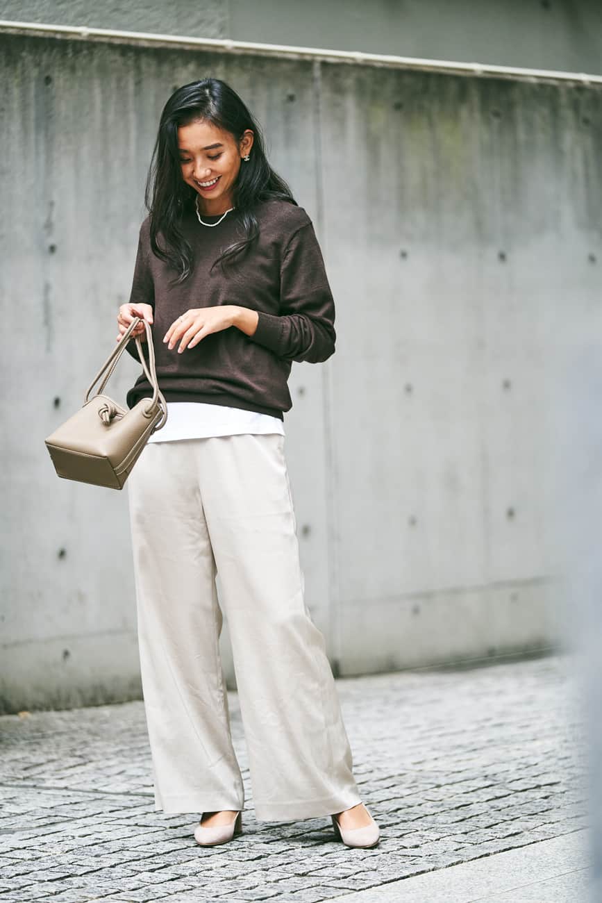 「秋冬トレンドのダークブラウンカラーのニットは、ベージュパンツを合わせて柔らかな印象に。白Tシャツをインして裾から出し、アクセントにしました。小物を同系色でまとめれば大人な雰囲気が手に入ります」(鈴木詩織さん・IT関連会社勤務 29歳 161cm)