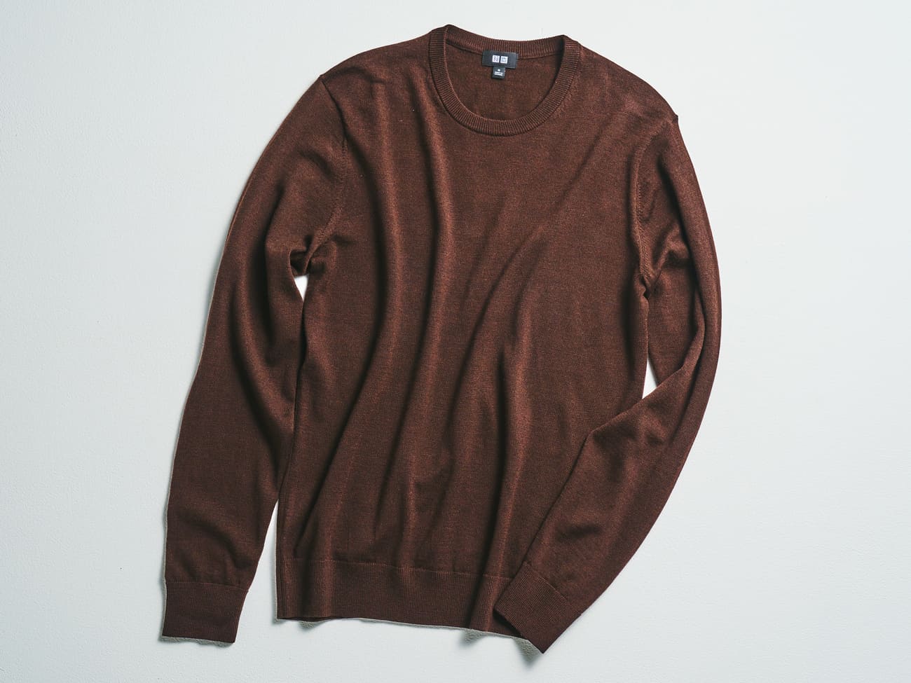 着心地の良い上質ウール100%の「エクストラファインメリノ」シリーズ。洗える、チクチクしない、など普段使いにぴったりです。今回着用したのはメンズのMサイズ。ブラウンカラーはメンズだけの展開色です。エクストラファインメリノクルーネックセーター ¥2,990(UNIQLO)