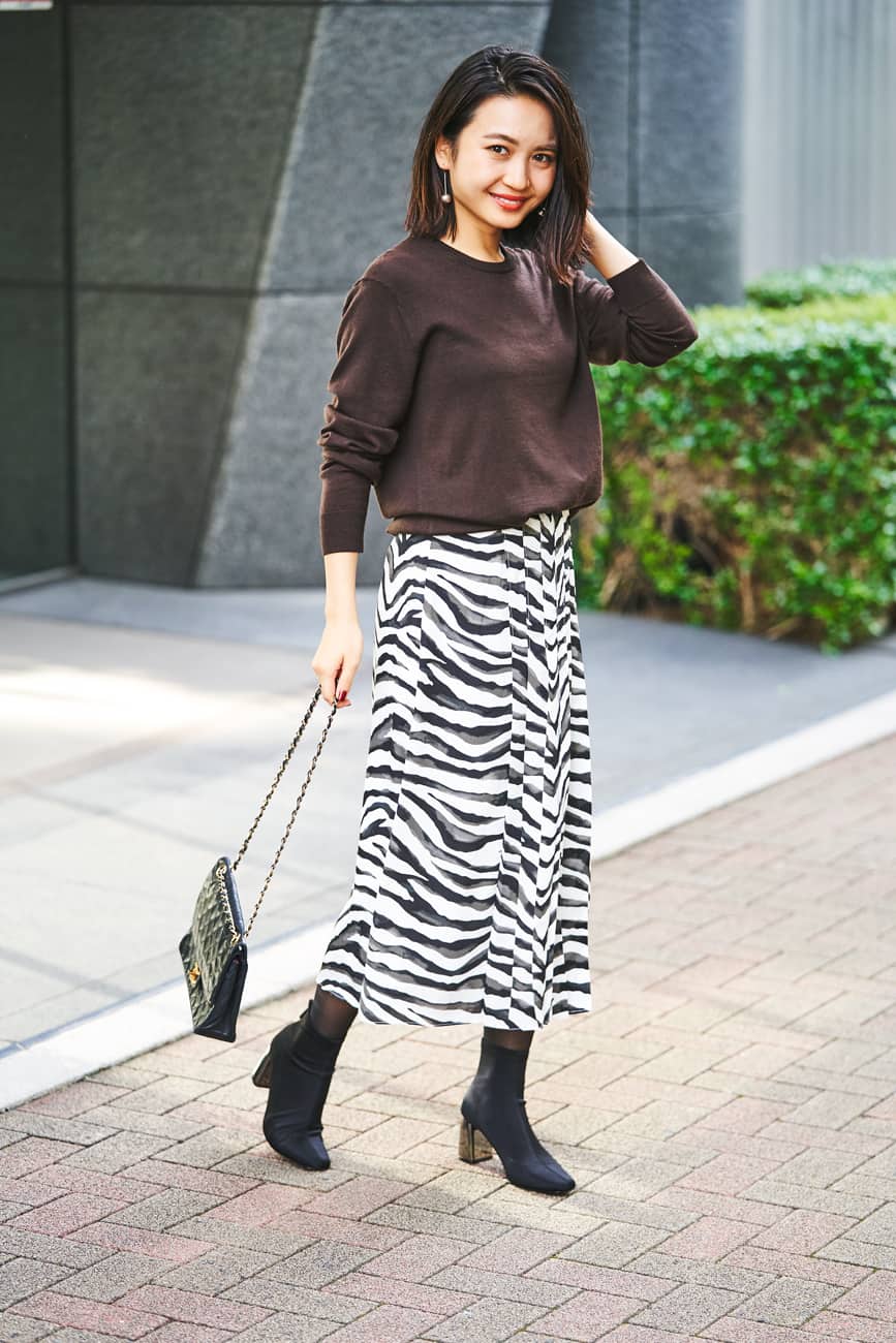 「モノトーンのゼブラ柄スカートを合わせて飽きのこないニットコーデに。シンプルなニットの日はスタイルアップを狙いたいのでヒールのブーツを合わせます。メンズサイズといってもそんなに大きくないので、ほどよくゆるっと今っぽいシルエットの着こなしが楽しめますね」(夏目頌子さん・IT関連会社勤務 28歳 159cm)