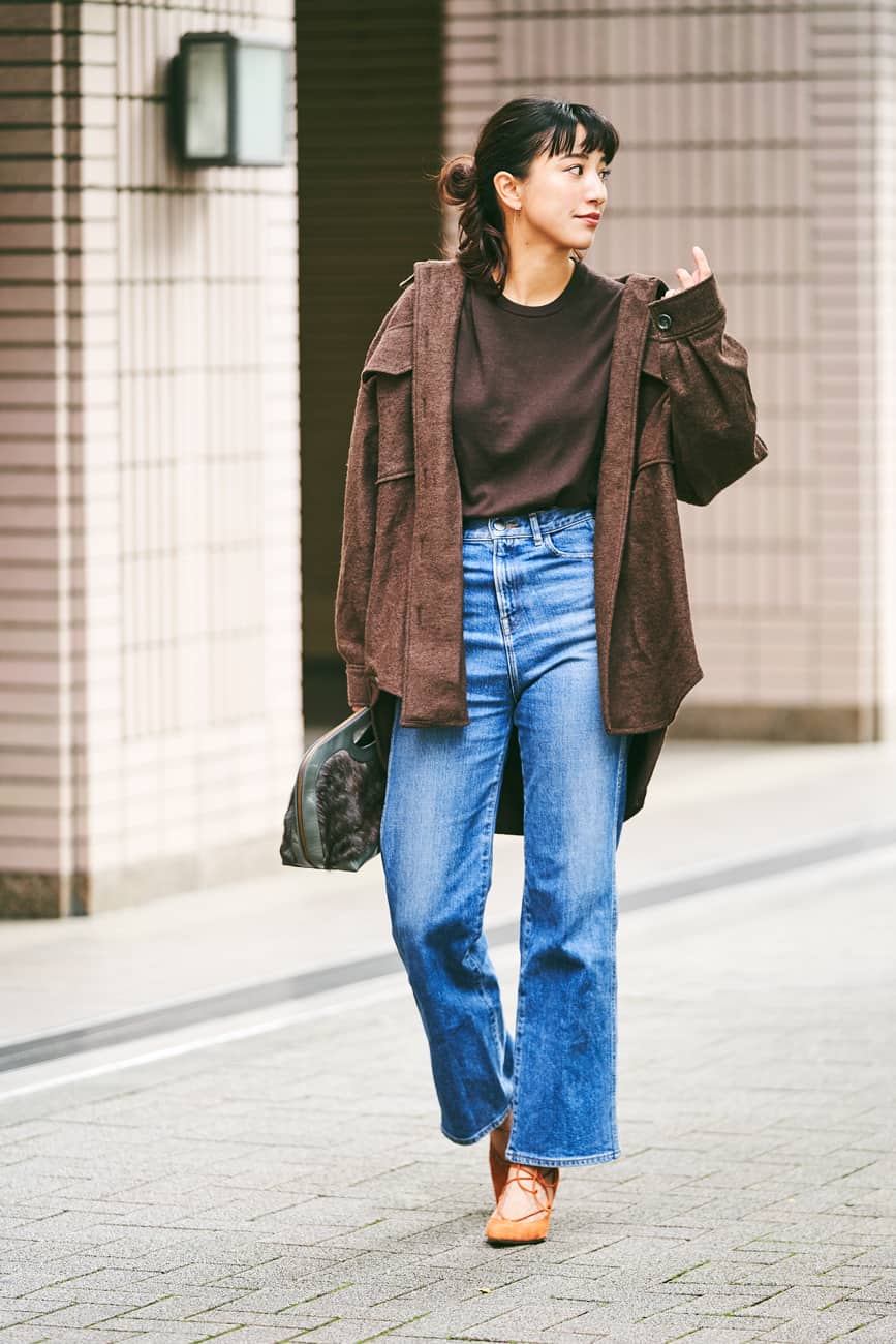 「ジャケットとニットのカラーを同色でまとめ、異素材ミックスのこなれ感を意識。ベーシックなニットなので羽織りのインナーとして取り入れました。単調になりがちなデニムコーデなので足元に差し色を入れています」(立花朋美さん・アパレルプレス 29歳 165cm)