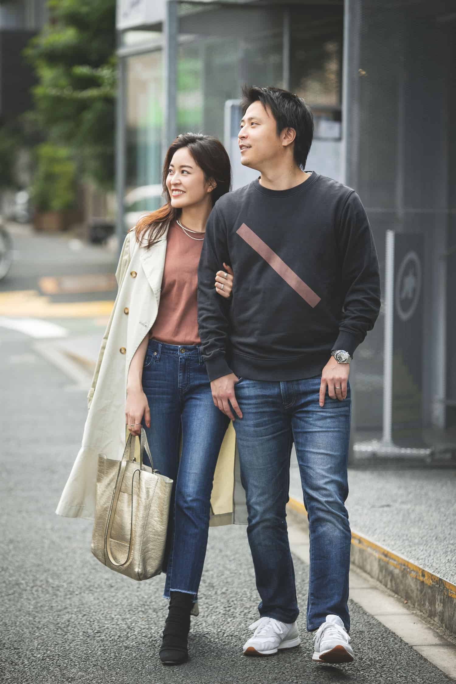 <金城さん>Coat:STELLA McCARTNEY Tops:UNIQLO Denim:ICB Bag:GIANNI CHIARINI Boots:Emilio Pucci <庄野さん>Tops:Saturdays NYC Denim:UNIQLO Shoes:New Balance
