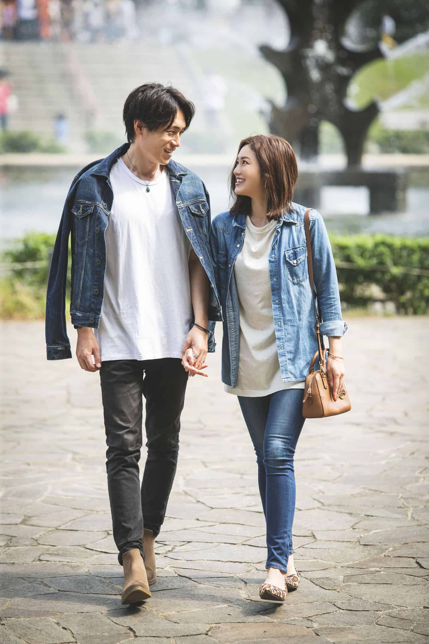 「デニムパンツの風合いやブランドが異なっても、デニムシャツを羽織ればぐっとお揃い感がアップ。インナーの色は白で揃えるとキレイめな印象に。季節感は小物の色で整えて、お出かけにぴったりのデートコーデの完成です」