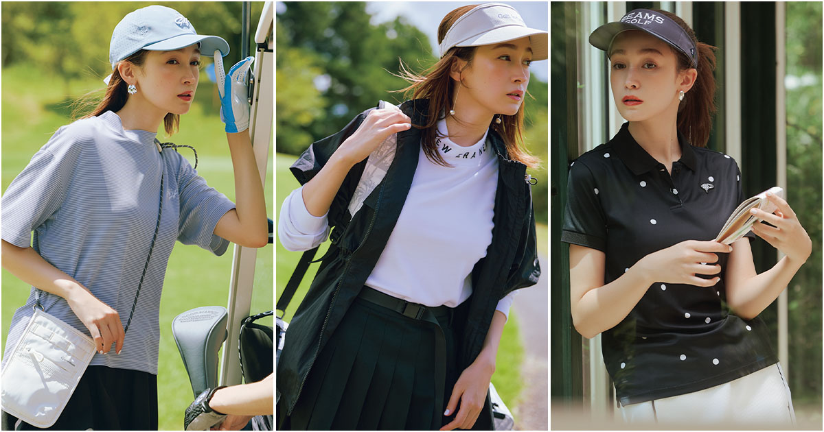 まだ暑い日のゴルフのワンツーコーデこそ、センスの見せどころ。単調にならないよう、ポロシャツはドットプリントをチョイス。モノトーンかつ、さりげないドットで甘すぎずに洗練感を上手にキープできます。ライン入りの台形スカート合わせが、ヘルシーに転ばす秘訣。ポロシャツ¥17,600スカート¥20,900サンバイザー¥6,600(すべてビームス ゴルフ/ビームス ゴルフ 有楽町)ピアス¥22,660(バルブス/ZUTTOHOLIC)