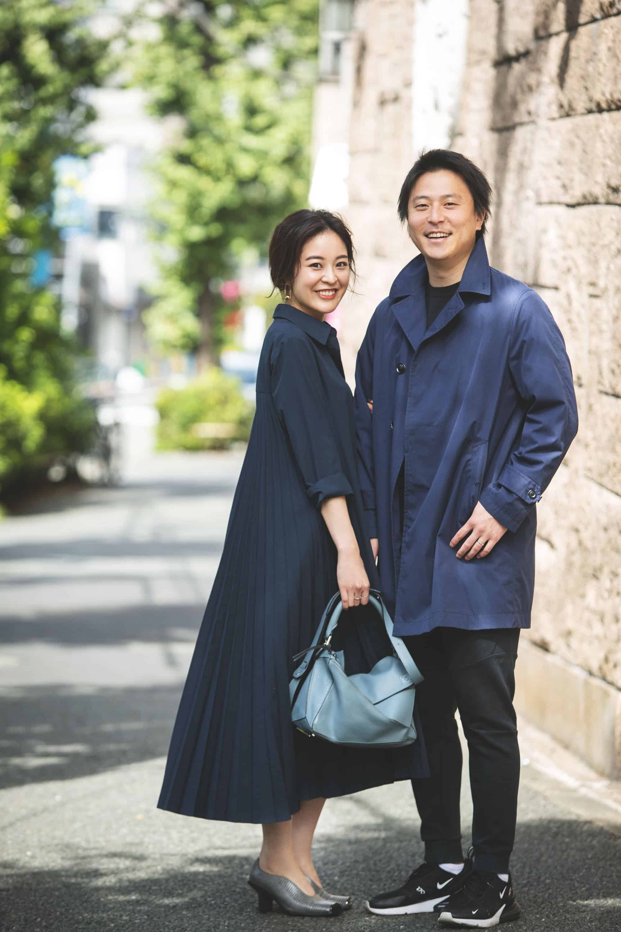 「彼のワードローブにも多いネイビー色のワンピースを私のコーディネートに取り入れました。体のシルエットが出にくいシャツワンピなので、足元を出して肌見せを。カジュアル感が強い彼のコーデはスマートなコートを羽織ればお出かけにもぴったり。リンクコーデはデート中の一体感が出る気がして好きですね」(左:金城華乃子さん・28歳 フリーランスPR/ライター 162cm、右:庄野 元さん・32歳 広告代理店勤務 175cm)