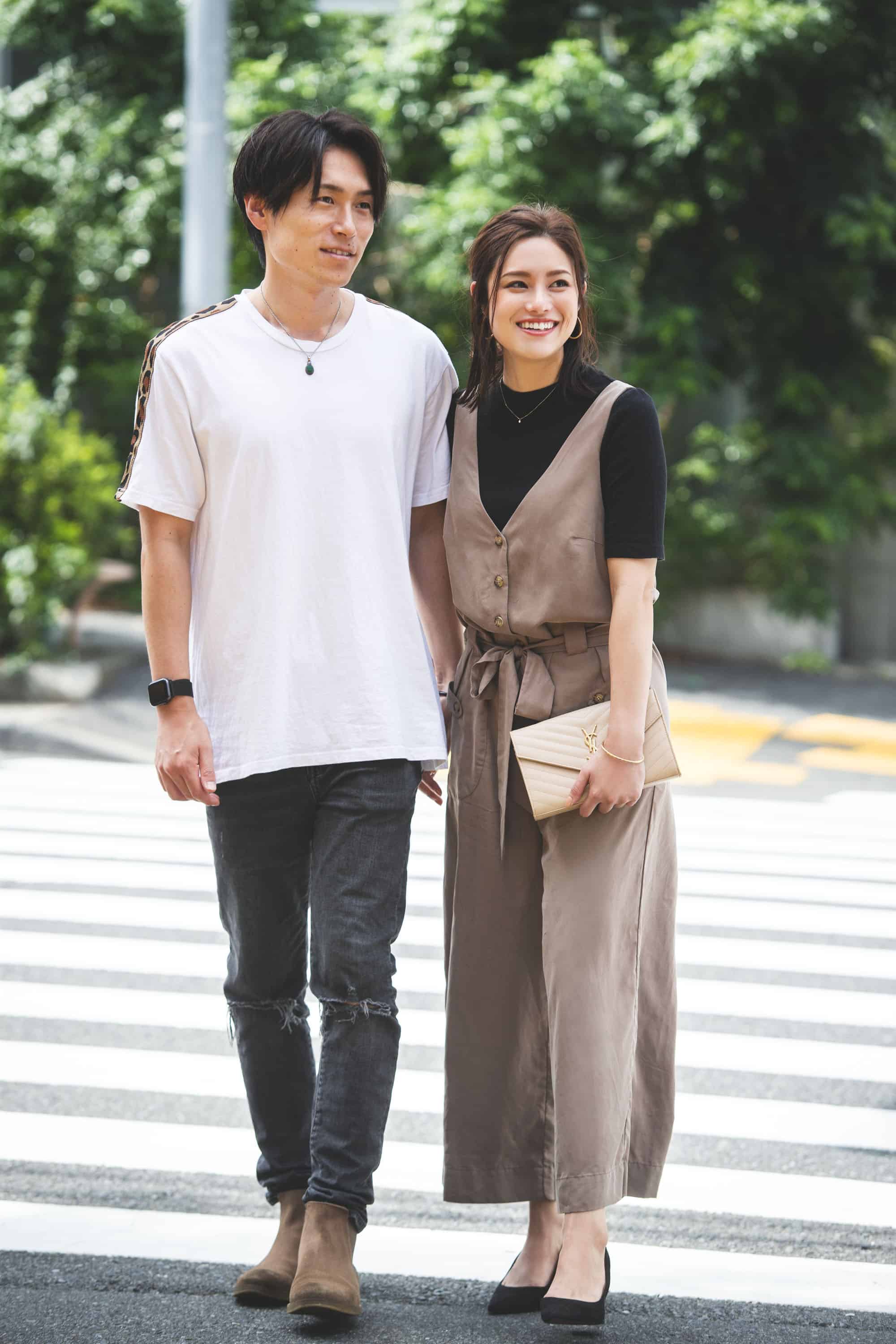 「秋、手持ちのアイテムで増えるベージュやブラウンなら彼も合わせやすいかな?と思って、ベージュのオールインワンを主役にしました。彼がよく履いている靴を履いてもらって、プチリンクの完成。合わせをモノトーンやデニムなどベーシックでまとめるとコーディネートしやすいです」(右:井上友美さん・30歳 外資系金融関係勤務 162cm 左:西岡和輝さん・32歳 外資系IT企業勤務 178cm)