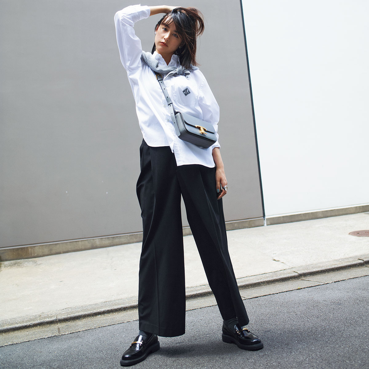 白シャツ×黒のワイドパンツがコンサバになりすぎないように、シャツはあえてオーバーサイズを選び、裾をアウトしてラフに着こなすのがポイント。グレーのスカーフを肩にゆるく巻けば、無難になりがちなモノトーンに立体感と今っぽさが生まれます。足元はローファーでクラシカルな品のよさをプラス。
