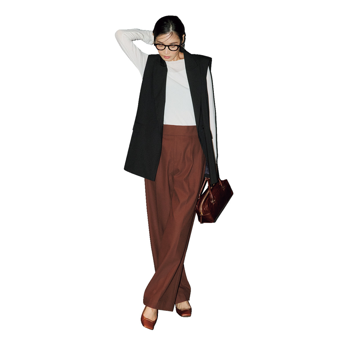 つい手に取るワイドパンツをブラウンに替えるだけで、ぐっと季節のムードが漂う装いに。黒のジレを重ねれば知的さが引き立ち、白トップスで軽やかさも両立。シンプルながら深みのある配色で、秋らしいキレイめオフィカジに仕上がります。