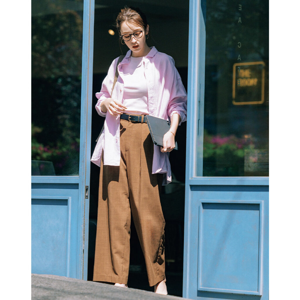 ブラウンのワイドパンツ×ピンクシャツは、シックな色でまとまりがちな秋のオフィカジに新風を吹かせてくれる組み合わせ。ほの甘ピンクをきれいめに引き締めるブラウンとの配色が絶妙で、退勤後の予定も軽やかにクリアしそう。黒ベルトをアクセントに添えることで、淡いトーンの着こなしにメリハリが生まれ、全体がぐっと引き締まります。