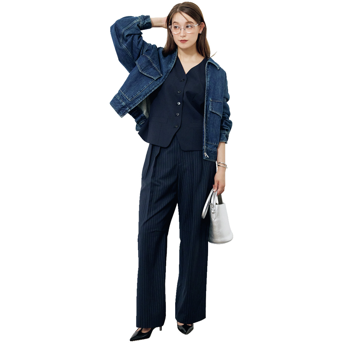 ストライプのワイドパンツ×ジレは、デニムジャケットで親しみやすく