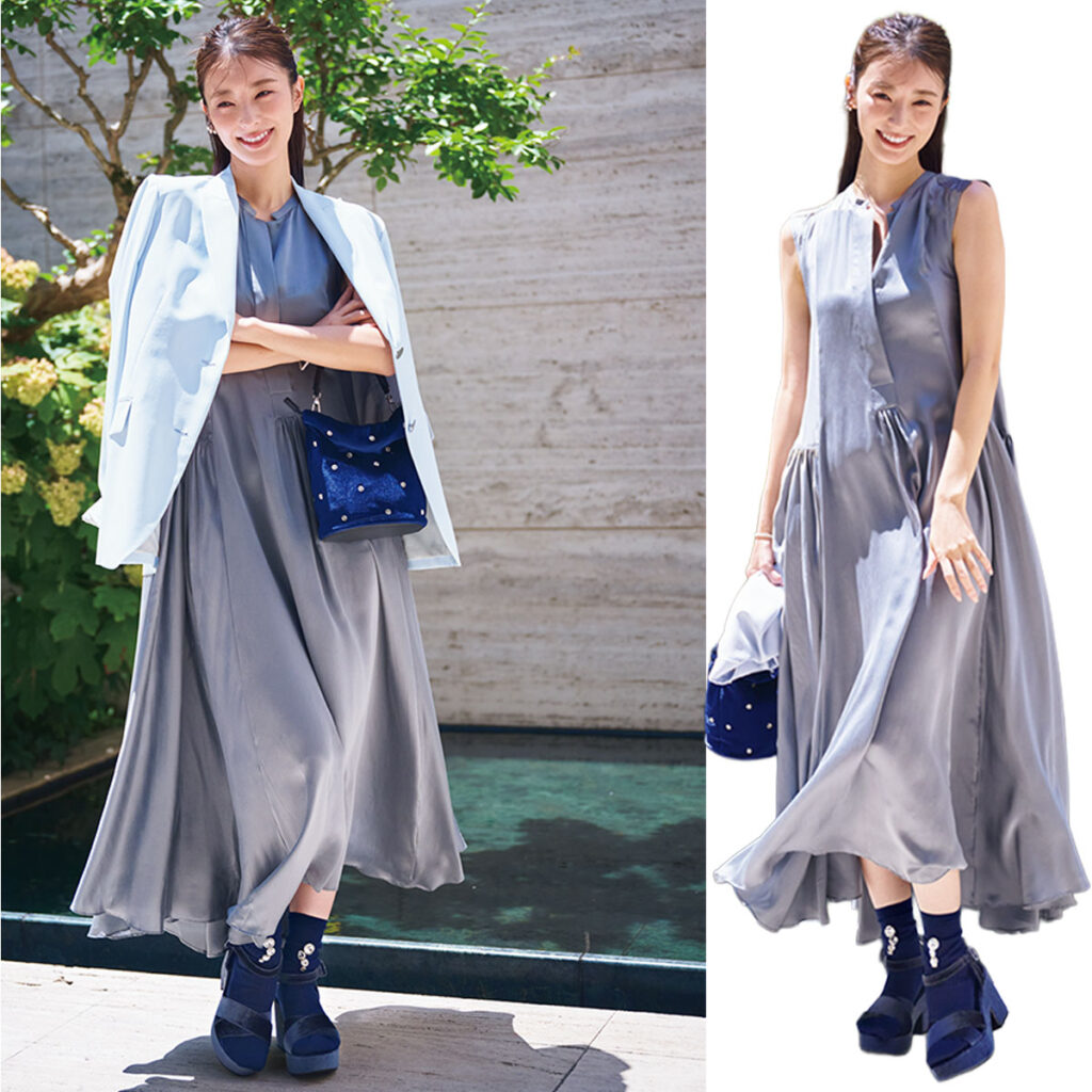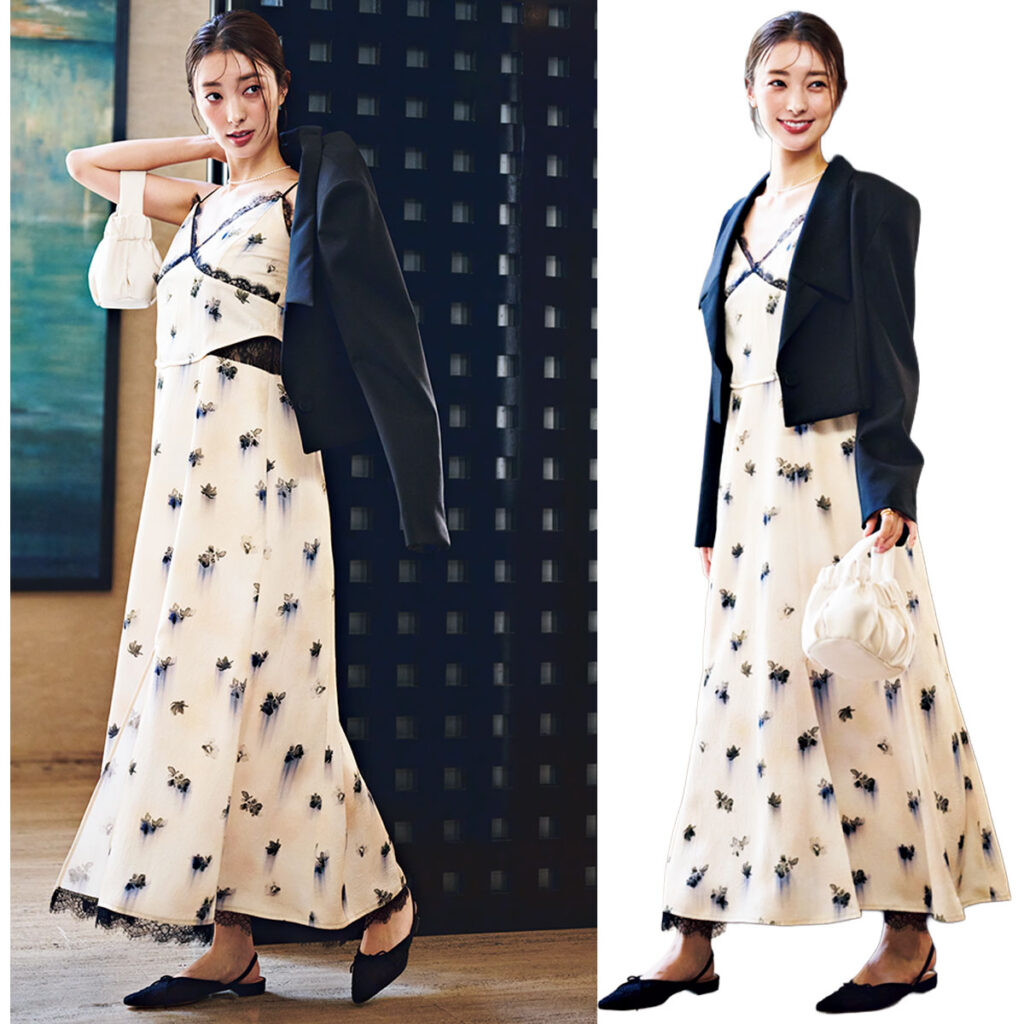 ワンピース¥64,900(カオス/カオス丸の内)ジャケット¥30,800(KASHIYAMA/カシヤマカスタマーサポート)バッグ¥19,800(ユナイテッドアローズ/ユナイテッドアローズ 渋谷スクランブルスクエア店)靴¥39,600〈STRINGART〉靴下¥7,700〈Maria La Rosa〉(ともにマルティニーク ルミネ横浜)イヤカフ¥36,300(カミーユ スロ/オブリオ)ブレスレット¥36,300(スワロフスキー・ジュエリー/スワロフスキー・ジャパン)