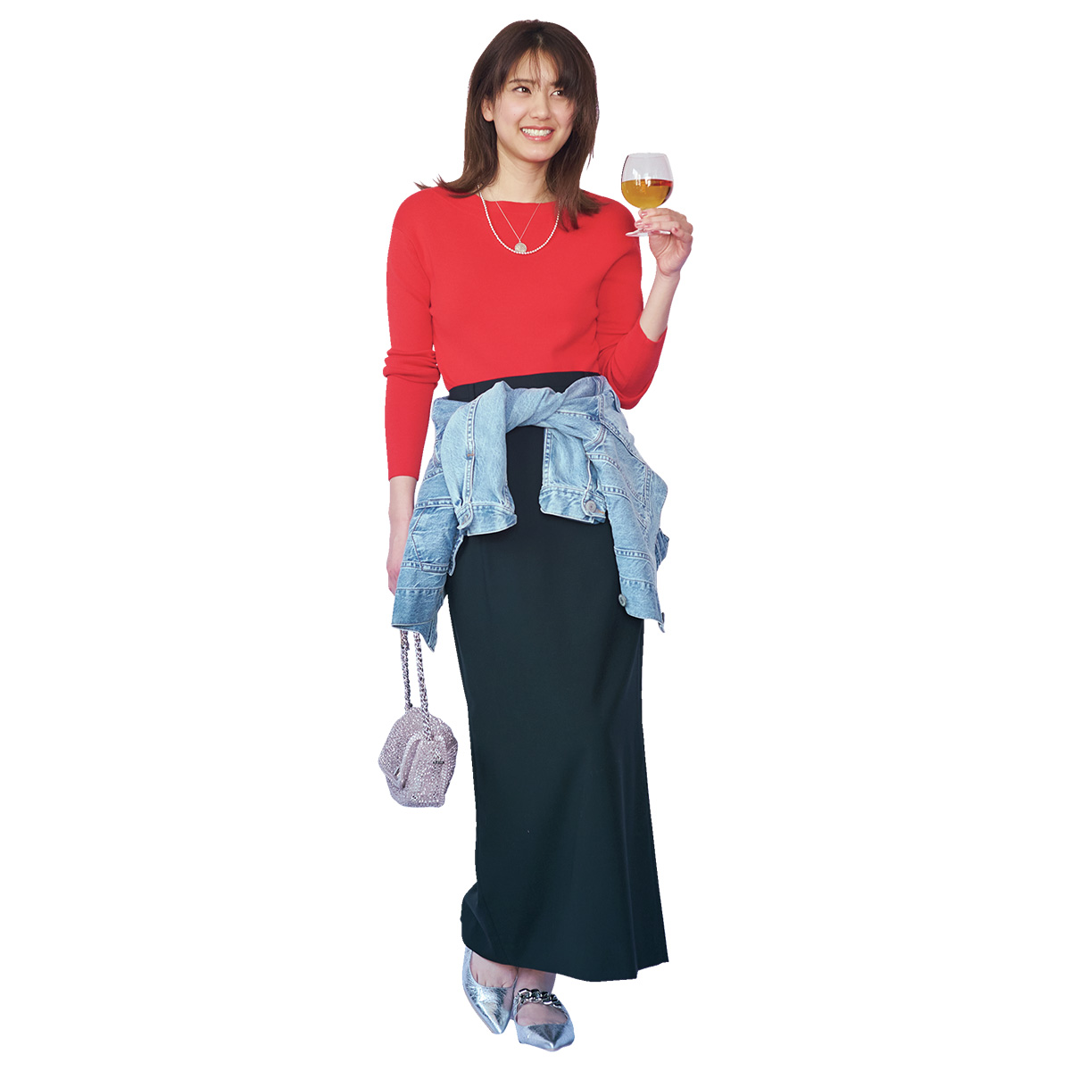 鮮やかな赤のリブニットは、着るだけで顔まわりまでパッと華やぐ主役アイテム。黒のロングスカートで引き締め、デニムシャツを腰に巻いて親しみやすさ添えれば、シンプルながらもコーデに奥行きが。シルバーの小物を効かせて、キレイめカジュアルを今っぽく更新。