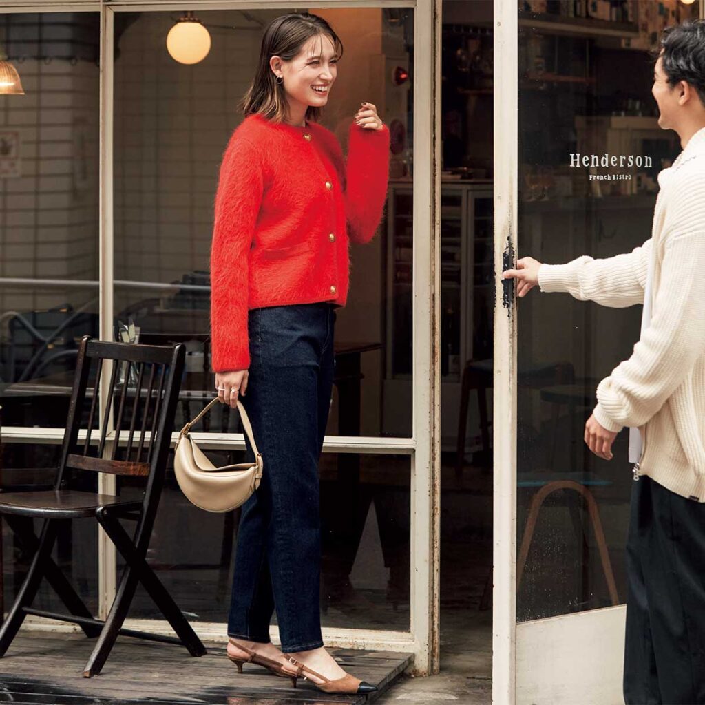 赤のカーディガンは、どこか特別な気分にさせてくれる存在。ボタンをすべて留めて着ることで、デニム合わせでもラフになりすぎず、品のある可愛げを漂わせます。いつもの自分でいられるのに、少しだけ背中を押してくれる…そんな、デートの日に頼りたい着こなしです。