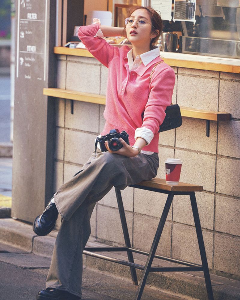 白シャツにピンクのポロニットを重ねた、ほどよくプレッピーなスタイル。甘めカラーも、グレーのワイドパンツで中和すれば大人っぽくまとまります。仕上げに黒のバッグやシューズを合わせて、全体をキリッと引き締めて。