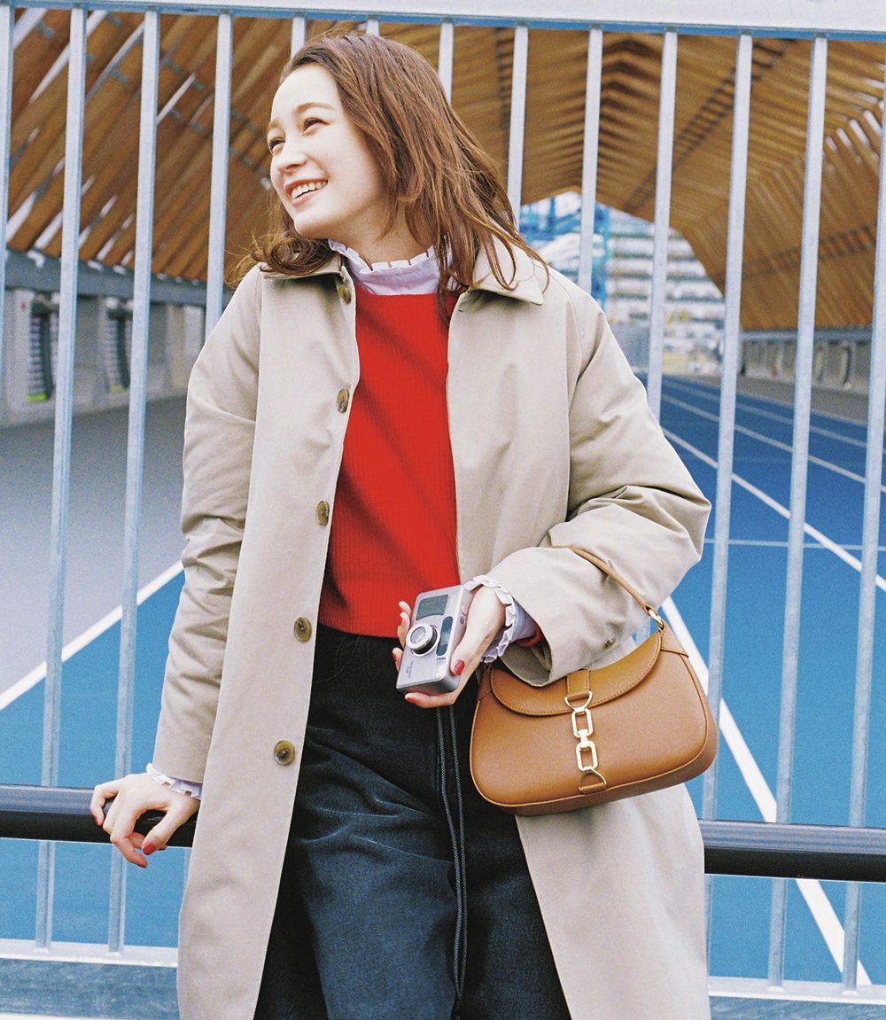 エネルギッシュな赤はコートの下に忍ばせるだけでも効果絶大。主張しすぎないのに存在感があり、ベージュやデニムのベーシックカラーを新鮮に見せてくれます。首元や袖からブラウスのフリルをのぞかせて、ほんのり甘いアクセントを効かせて。