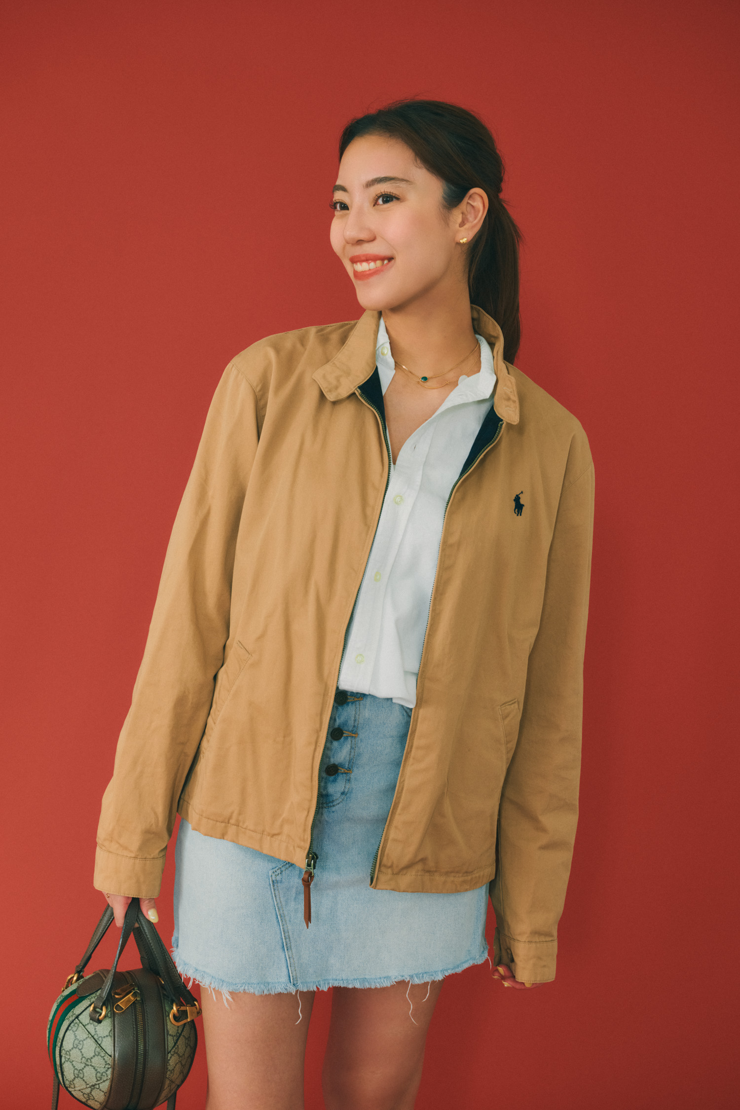 「今トレンドが茶系なので、ついつい茶系のアウターを手にとりがち。今の時季はデニムミニスカートを合わせるのが定番スタイル。ラルフローレンの白シャツを合わせると、ミニ丈も大人っぽく着こなせます。5年ほど前にオーストラリアで購入したクーカイのデニムスカートは、ボクシーなシルエットが可愛くてお気に入り。オーバーサイズのアウターともバランスが取りやすくて重宝しています」