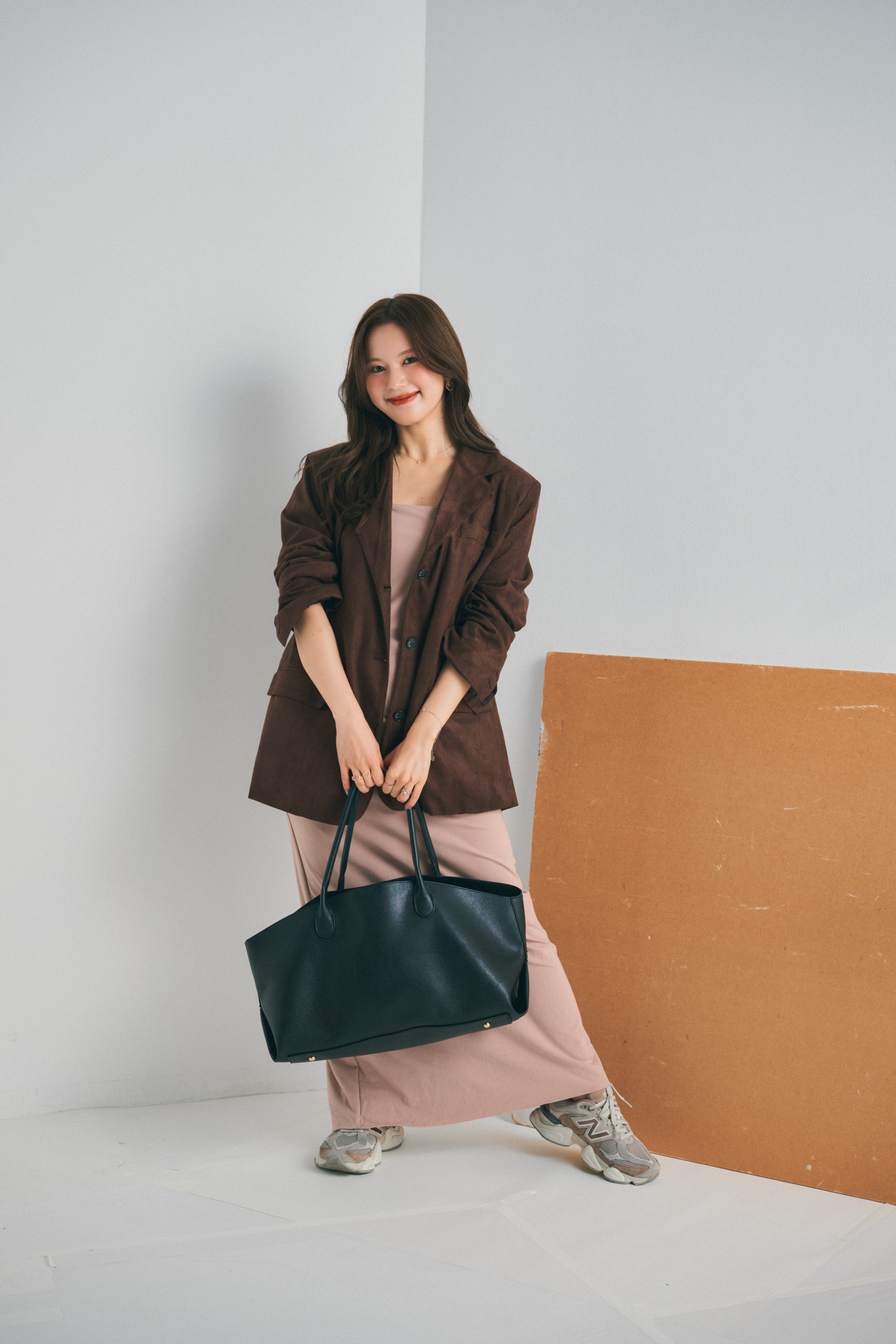 「ブラウントーンでまとめるのが今年の気分。スウェード素材のオーバーサイズジャケットは羽織るだけで旬のムードが漂う一枚。ワンピースに重ねてもほどよくこなれて見えます。バッグはキノ ザ ケイの大きめサイズを愛用中。旅行や機内にも持ち込みやすく、傷が目立ちにくいからデイリー使いにも最適。モードとカジュアルをミックスしたスタイルを楽しんでいます」