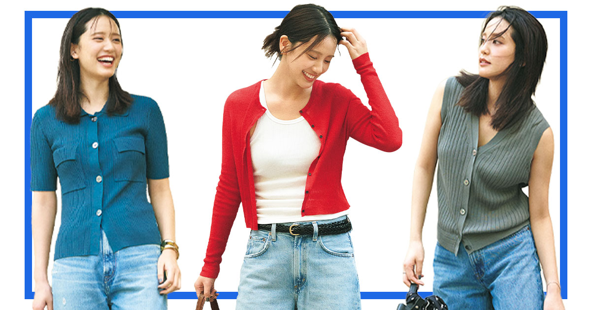 コンパクトなシアーカーディガンがデニムの美しいドレープ感を強調。メッシュベルトにビルケン、可愛い“赤”に、メンズなアイテムを効かせるのも新鮮!