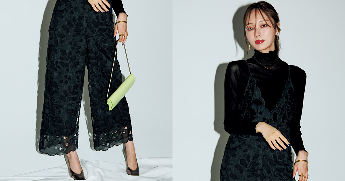 毎回なんとなく、黒ワンピ…安心で便利だけど、本当にこれが着たいんだっけ?そんな風に感じたら、更新のサイン。色味はそのまま、ワンピースからオールインワンに変えてみて。パンツスタイルになることで凛としたハンサムな印象にチェンジ。“通勤見えリスク”は、ツヤのあるレース素材を選んで難なく回避。よく見る衿付きではなくキャミタイプなら華やかで、着回しも利く。透けベロアのインナーに重ねればよりハレの日らしい装いに。