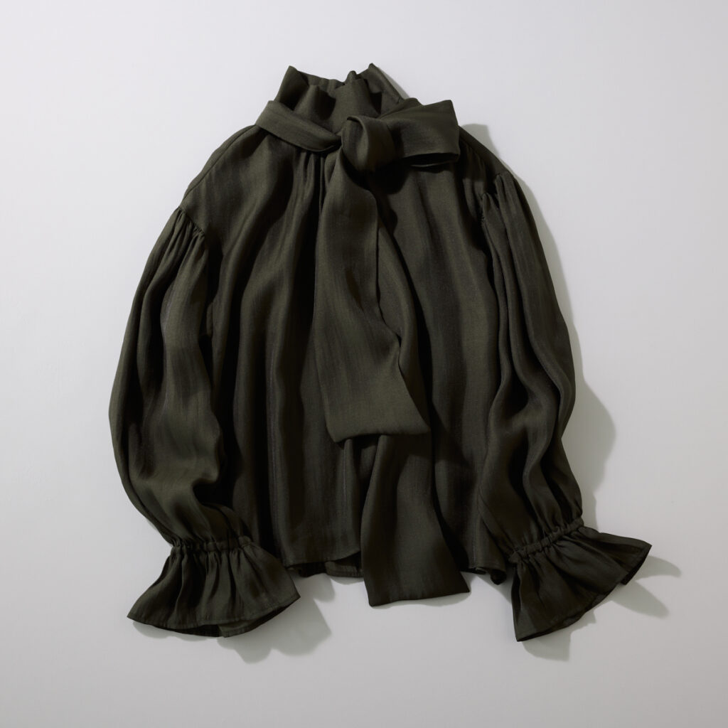 ボリュームのあるボウタイが華やかな印象を添えるブラウス。外せばスタンドカラーデザインとしても着られ、シーンや気分に合わせて表情を変えられます。程よいハリとツヤを備えたオーガンジー素材ながら、自宅で洗濯機洗い可能なのも嬉しいポイント。キャミソール付きで、忙しい朝もインナー選びに悩まず着こなせます。