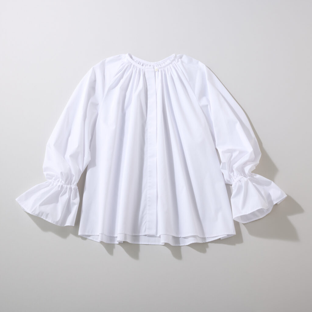 たっぷりのギャザーとクシュっと絞った袖口が印象的な、ブランドの人気デザインの復刻版。甘すぎずシンプルなデザインながら、どこか特別感のある一枚です。軽やかなコットン素材は洗って干してもシワになりにくく、そのまま着られるイージーケア仕様。デザイン性と機能性を兼ね備えた、働く女性に寄り添うブラウスです。