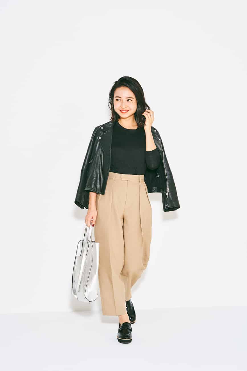 「センタープレス&ハイウエストデザインのパンツは履くだけできれいめに見えます。トップスをインをして腰の位置を高めにすればSサイズでもフラットシューズを難なく着こなせます」(夏目頌子さん・28歳 IT関係勤務 159cm)