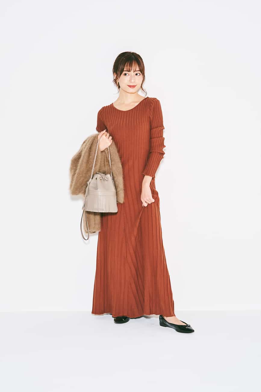 「かかとの位置まで長さがあるマキシ丈のワンピースはヒールを合わせてしまうと、コンサバに見えてしますのでフラットシューズで抜け感を出すのがポイント。ストンとしたマキシワンピなら、Sサイズでも着こなしやすいです。シンプルなバレエシューズはワンピースとの相性抜群です」