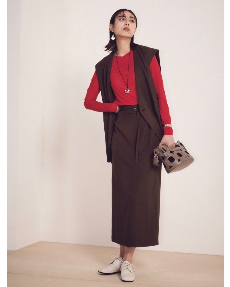 10月20日(月)、ボクシーなジレとナロースカートのセットアップに、鮮やかなレッドのトップスを差し込んで、秋らしい温かみを感じる配色に。ブラウン×レッドのコントラストが、知的ながらも華やかな印象を演出します。個性派デザインのバッグとシルバーアクセでエッジを効かせれば、モード感漂う大人の通勤コーデが完成。