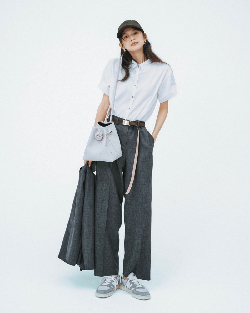シャツ¥6,589ジャケット¥22,000パンツ¥12,000(すべてオリヒカ池袋東口店)ベルト¥13,200(レフィエ/フラッパーズ)キャップ¥4,840(ニューエラ)バッグ¥51,700〈ヴァジック〉ピアス¥39,600イヤカフ¥27,500〈ともにメゾンヴァジック〉(すべてヴァジックジャパン)スニーカー¥14,960(ニューバランス/ニューバランスジャパンお客様相談室)